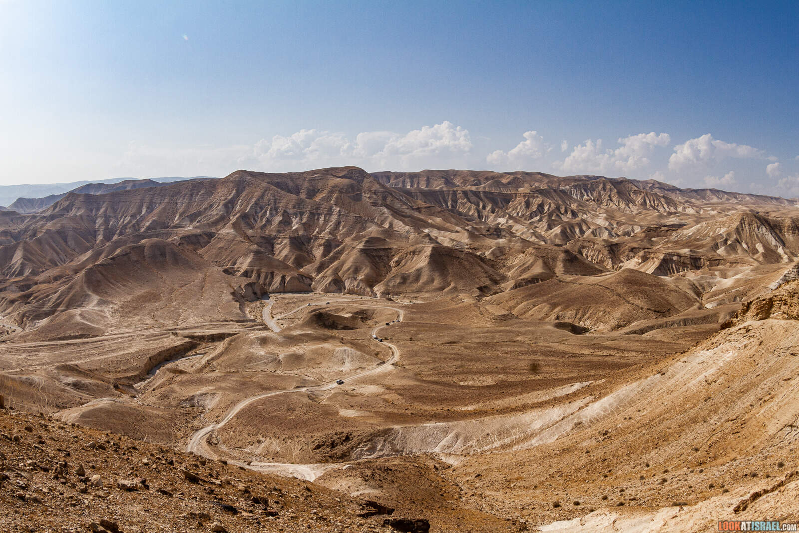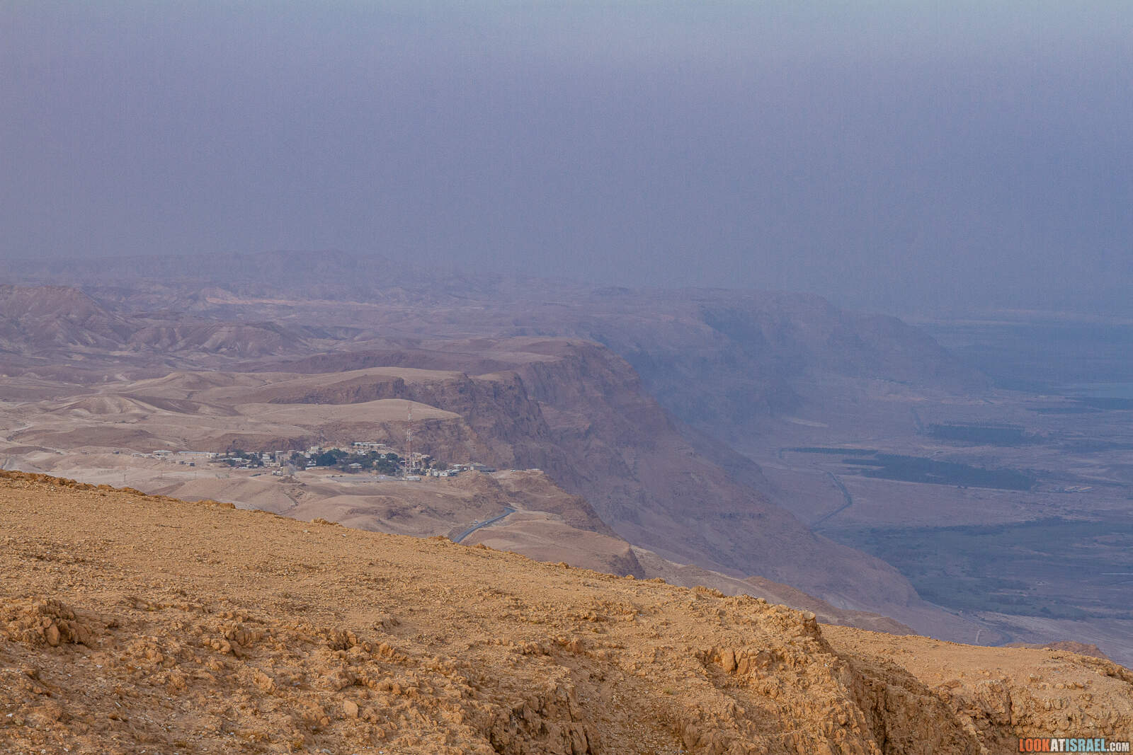Открытием для меня стала обзорная точка Михвар. Внизу поселок Мицпе Шалем, а вокруг горы, глубокие ущелья и Мертвое море