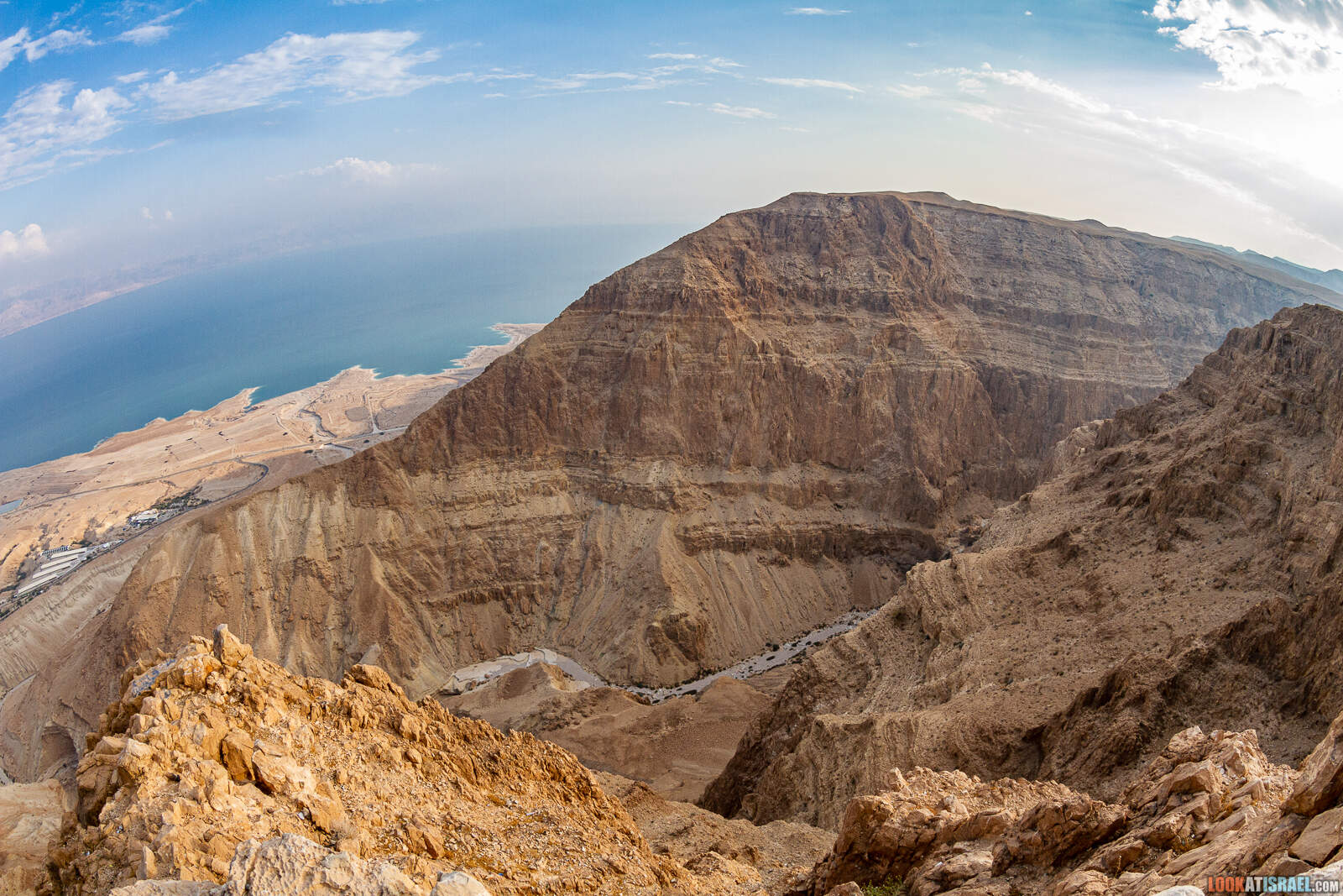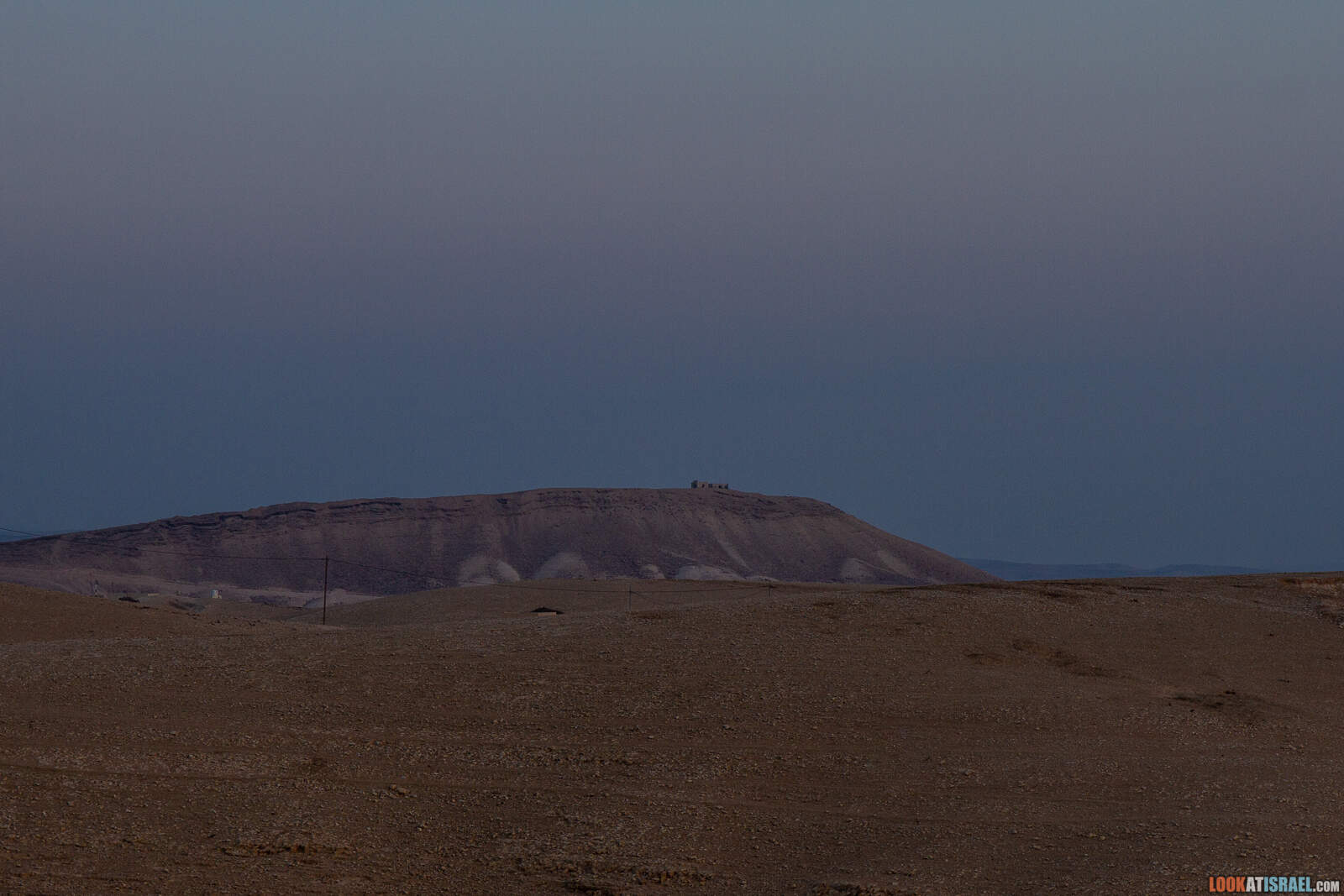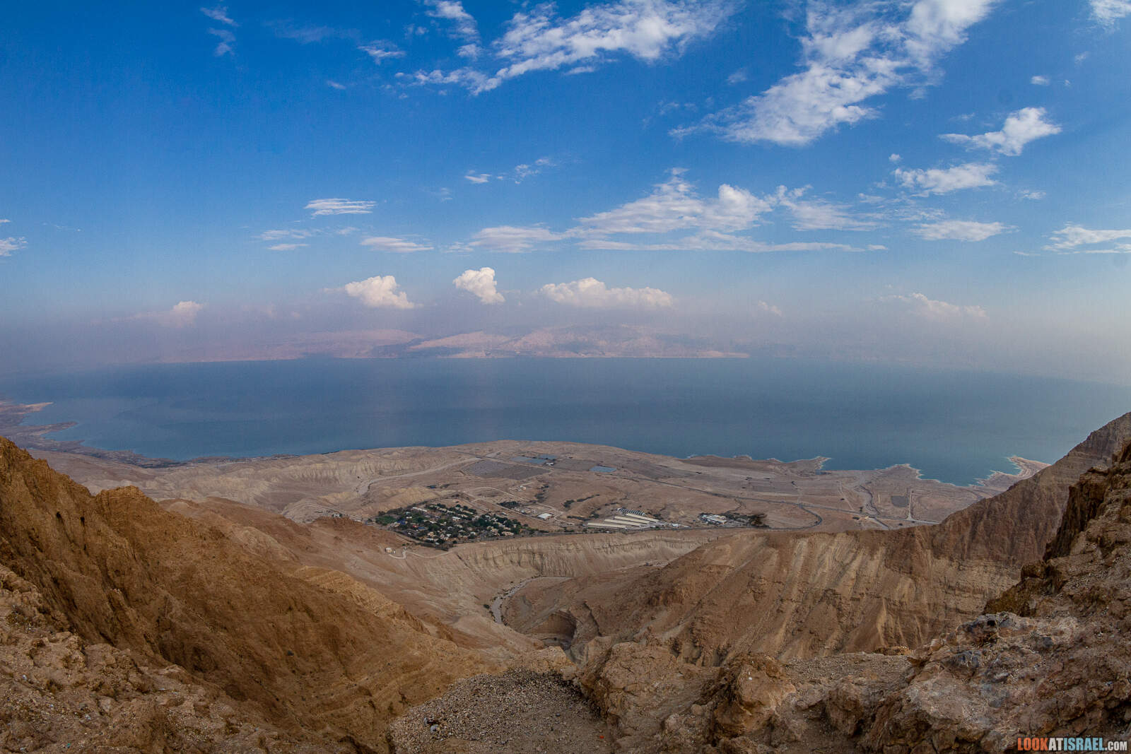 Маленький оазис жизни вдали это кемпинг Мецукей Драгот, откуда я наблюдал самый красивый рассвет на Мертвом море. И отсюда же видно всю мощь Мацок Этеким.