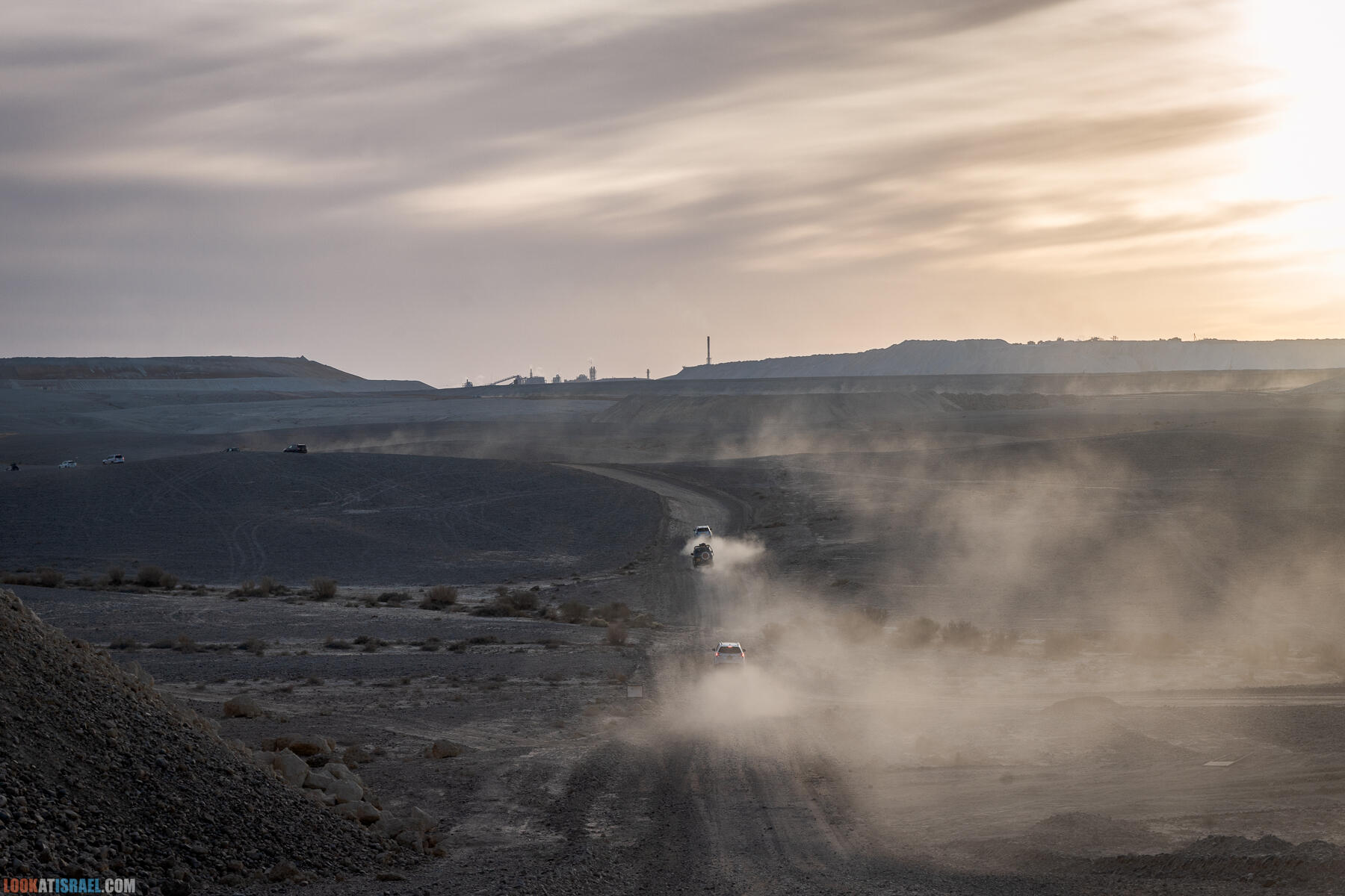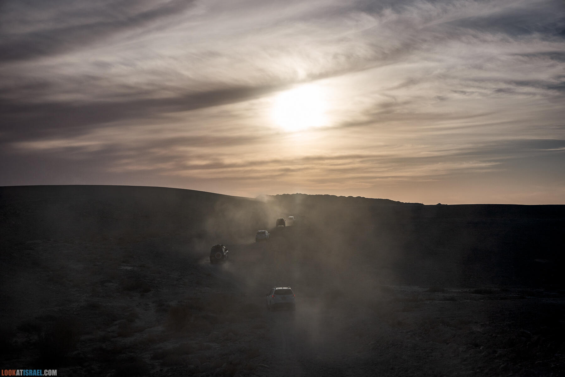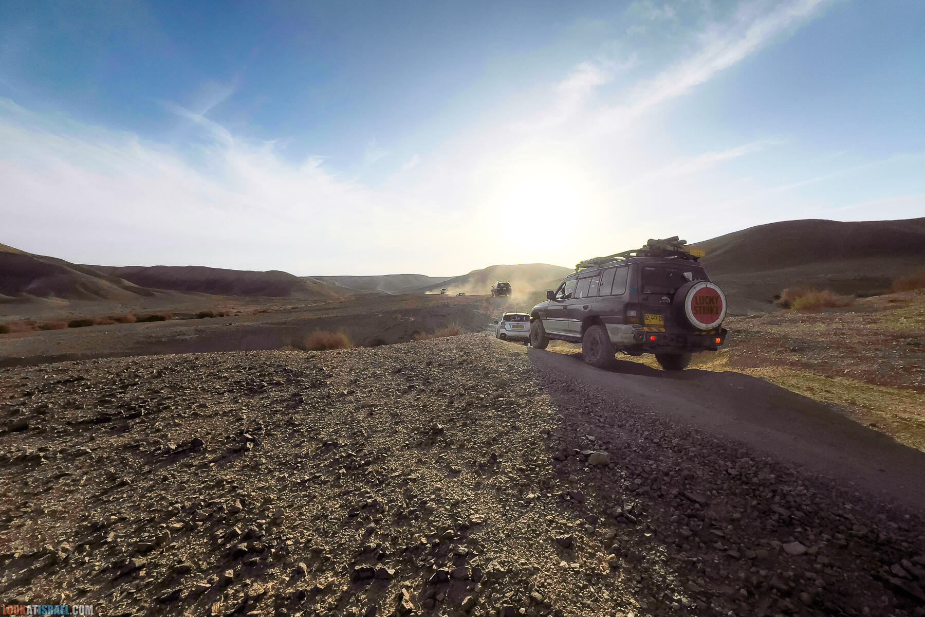 Дни сейчас короткие, поэтому довольно быстро появилась возможность сделать фотографии внедорожников, едущих навстречу закату