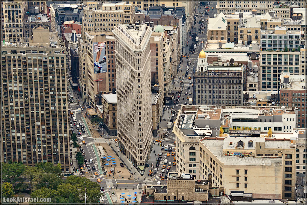 Как известно все улицы и авеню на Манхэттэне параллельны и перпендикулярны друг другу. И лишь Бродвею больше всех надо и потому он проходит наискосок. Таким образом он «разрезает» некоторые сформировавшиеся «блоки» на треугольники. Не знаю как решают это проблему на других перекрестках, но на образовавшемся треугольнике 5-ой авеню, Бродвея и 25-ой улице стоит один из символов Нью Йорка — знаменитое здание-утюг Flatiron Building
