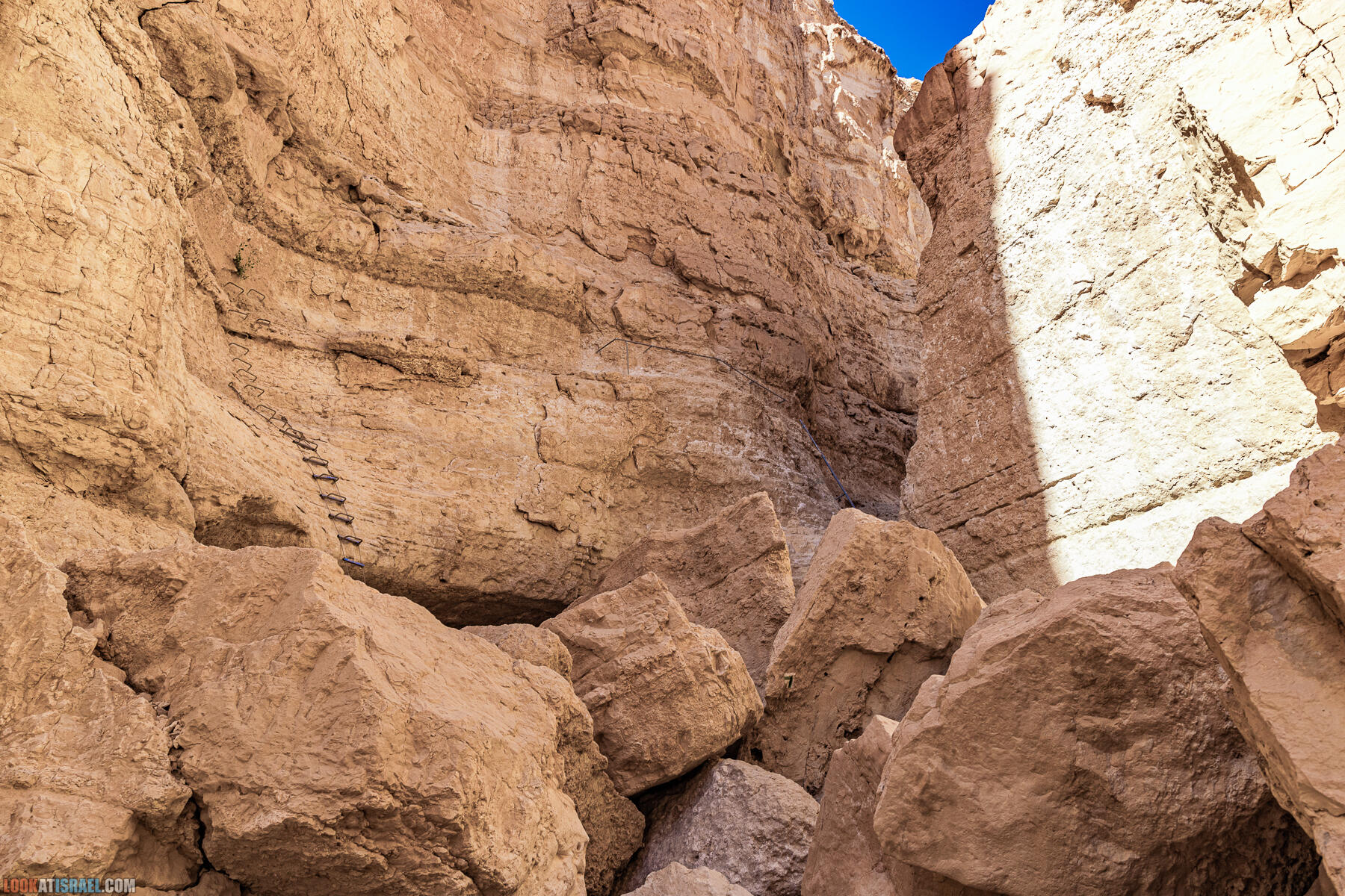 Чтобы выйти из ущелья придется преодолеть страх высоты (тем у кого есть) и пройти по двум лестницам и скобам (ищите все на фотографии ниже)