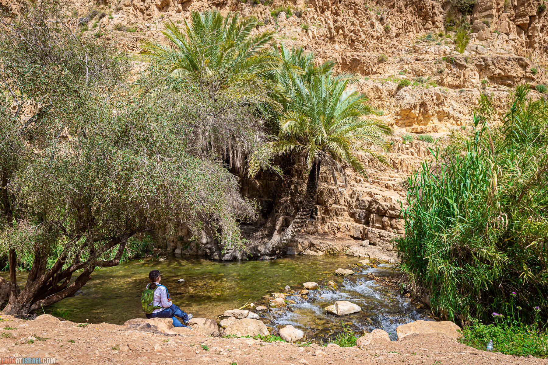 Это источник Эйн Уджа — супер красивый зеленый оазис в сердце Иорданской долины. Есть у него и название ивритское — нахал Итаб ( נחל ייט״ב — יד יצחק טבנקין) Название происходит от близлежащего еврейского поселения, а оно в свою очередь названо в честь Ицхака Табенкина