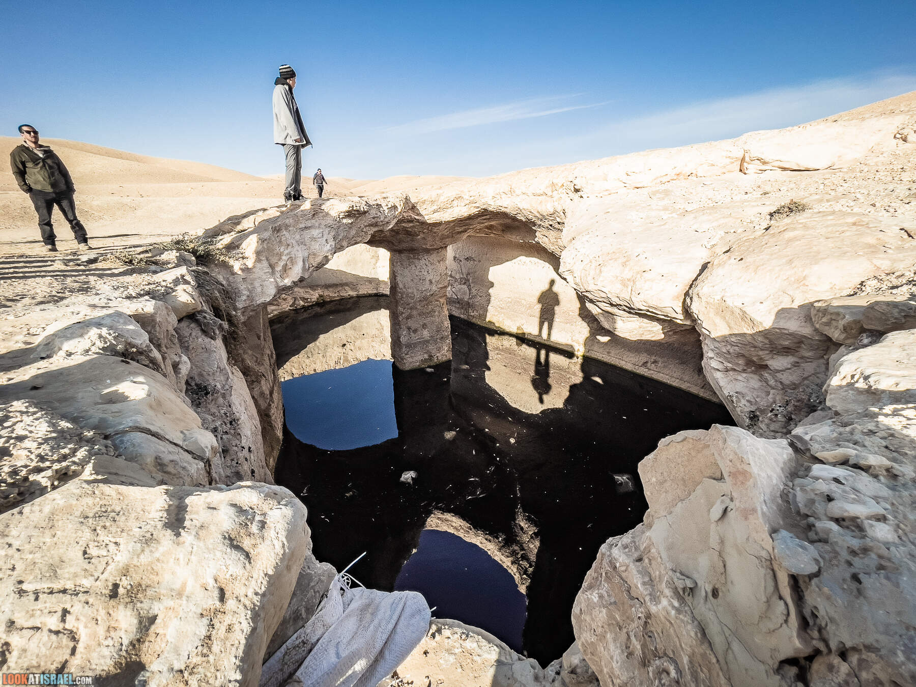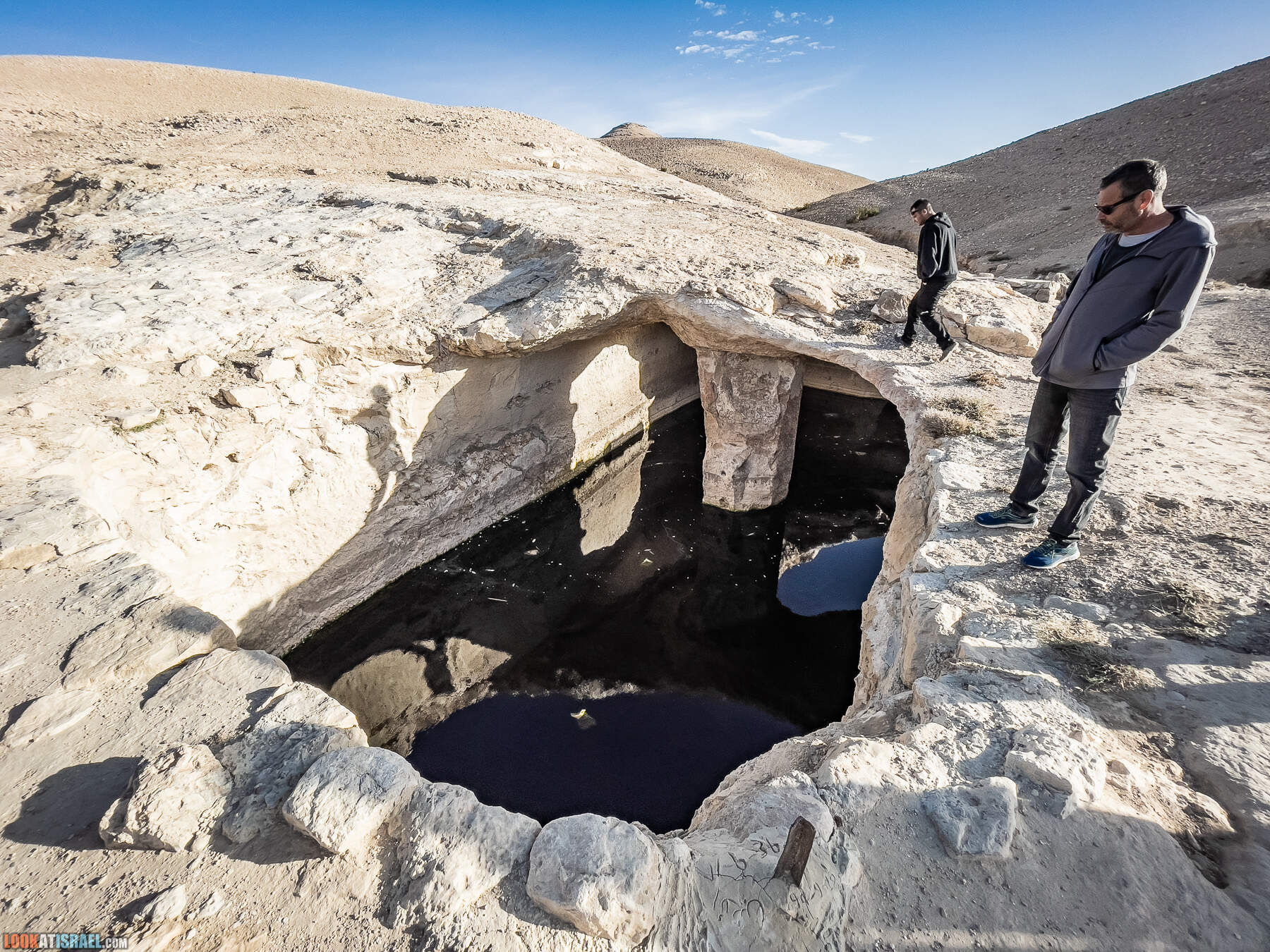 Недавно я рассказывал о подземном водосборнике, построенном в Иудейской пустыне царем Узиягу. Однако таких водосборников великое множество. Не все такие величественные как упомянутый ранее. Есть простые, а есть и не менее красивые. Вот именно два таких и показал нам Аднан, гостеприимный бедуин из поселка Ум Дарадж. Он же приготовил для нас ужин в настоящей бедуинской печи (смотрите видео), а на следующий день продемонстрировал, что чтобы ездить по пустыне джип совсем не нужен.