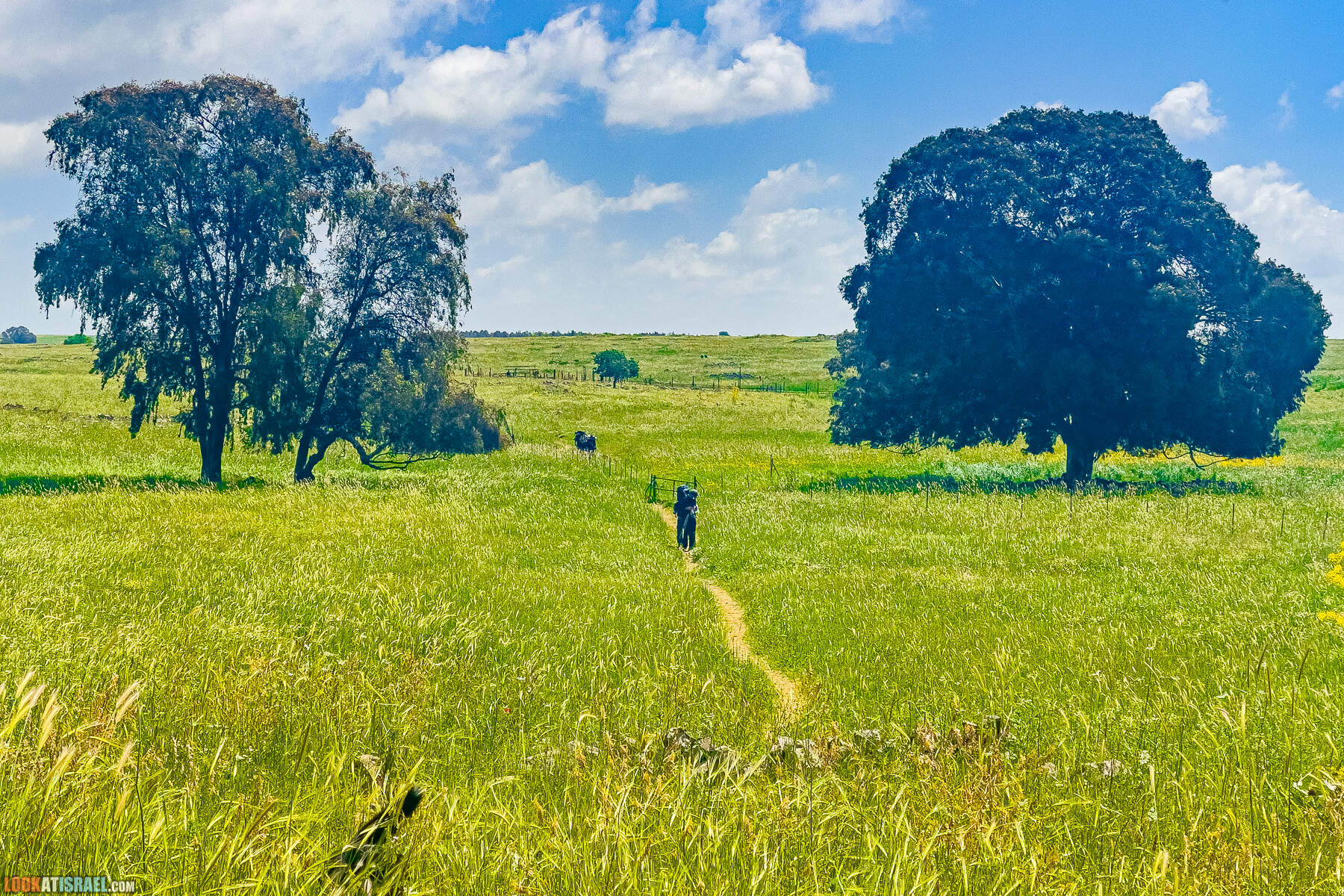 Оставив авто идем через рощицу эвкалиптов и мимо столиков и ищем разметку Тропы Голан (белый-синий-зеленый) и по нему движемся на северо-восток (в сторону дороги).