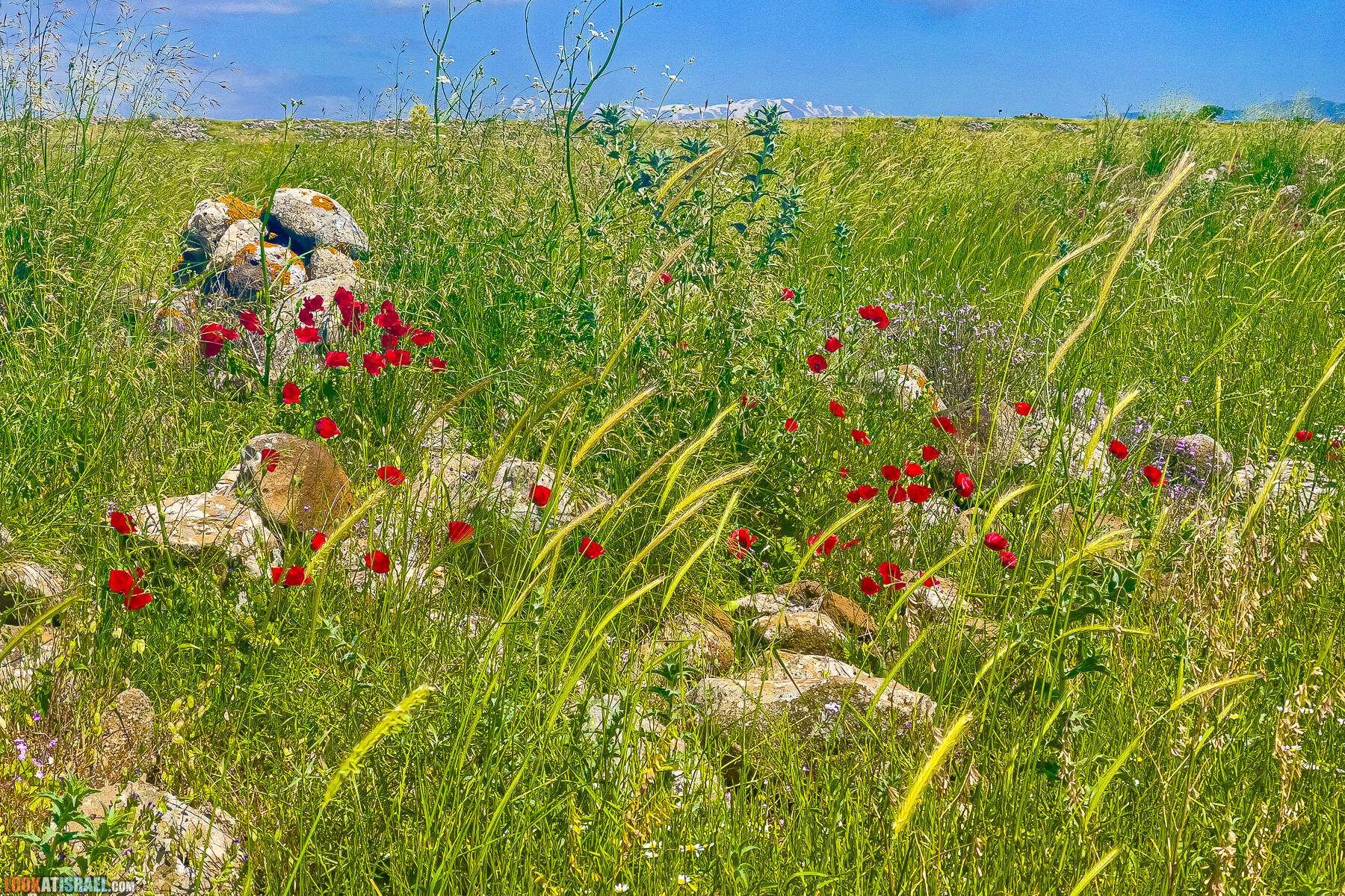 Когда по всей стране уже все отцвело и выгорело, на Голанских высотах все еще можно найти красные маки в зеленой траве.