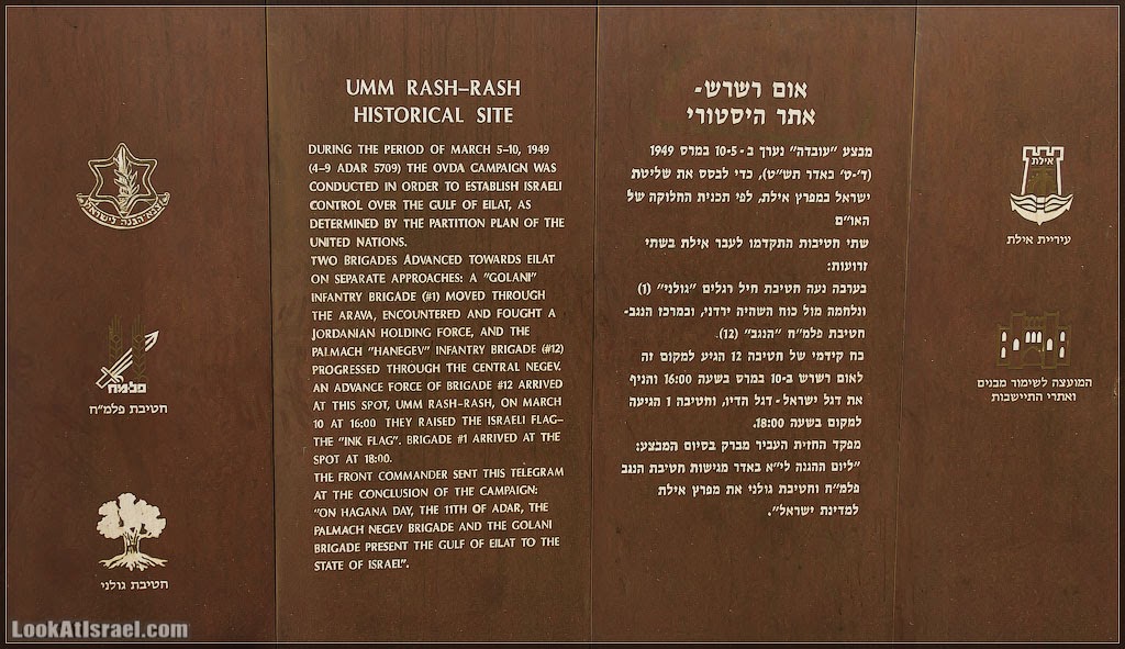 Импровизированный флаг провисел на флагштоке всего пару часов: когда в 17.00 в Умм-Рашраш прибыли силы спасательные силы 19 батальона бригады Голани, его солдаты, снабженные лучше солдат Негева, поменяли чернильный самодельный флаг на официальный флаг Израиля. Командиры обеих бригад, Нахум Сариг и Нахум Голани, передали радиограмму: «Передайте Правительству Израиля: ко дню обороны 11 адара бригады Негев-Пальмах и Голани преподносят Эйлатский залив Государству Израиль»