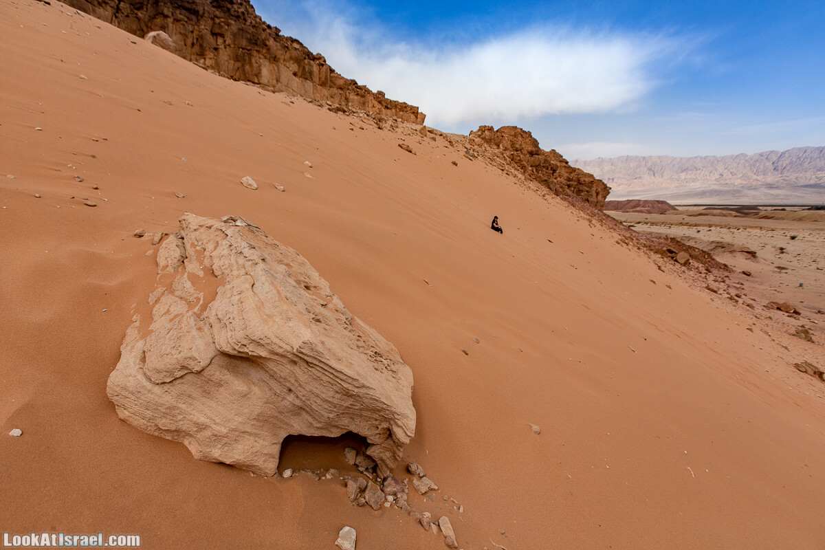 Отдыхая как-то по системе «всё включено» один из вечеров и день отъезда были посвящены ранее не известным для меня местам в районе Эйлата. Как оказалось таковых в пределах 10-15 км от города великое множество. Тут и дюна, по которой можно скатываться и сбегать собирая песок в боты, и скрытое огромное озеро с изумрудной водой, и шикарная смотровая площадка, и виды на Синайские горы и границу со страной фараонов. Короче, окрестности Эйлата полны сюрпризов.