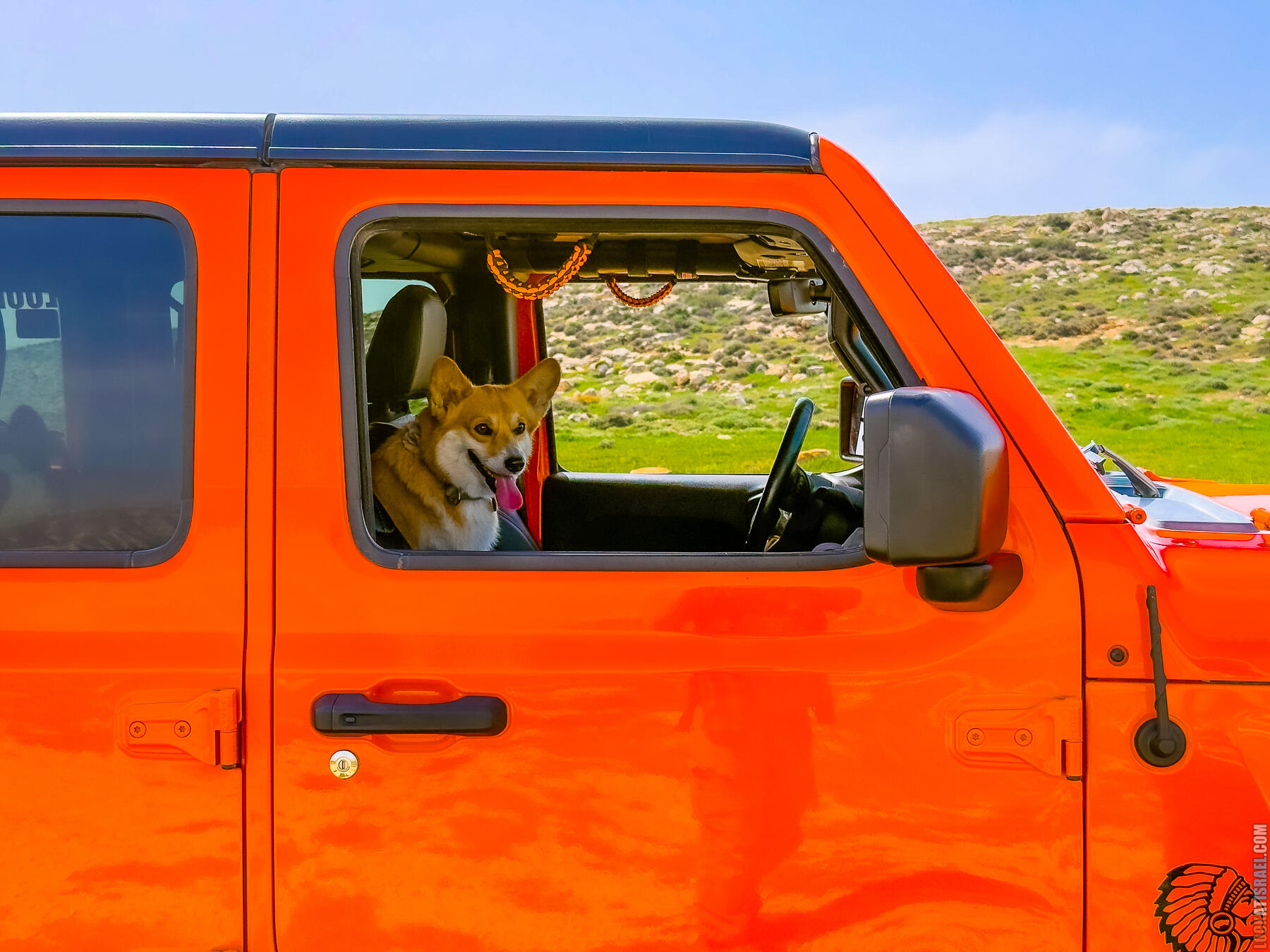 Три младшие корги на заднем сиденье в радостном ужасе и лишь корги Иви смотрит во все окна сразу с видом абсолютного знатока.