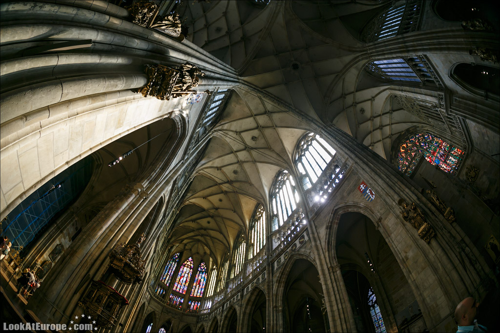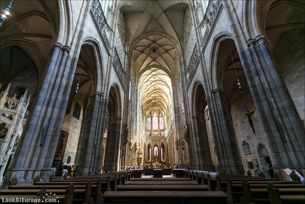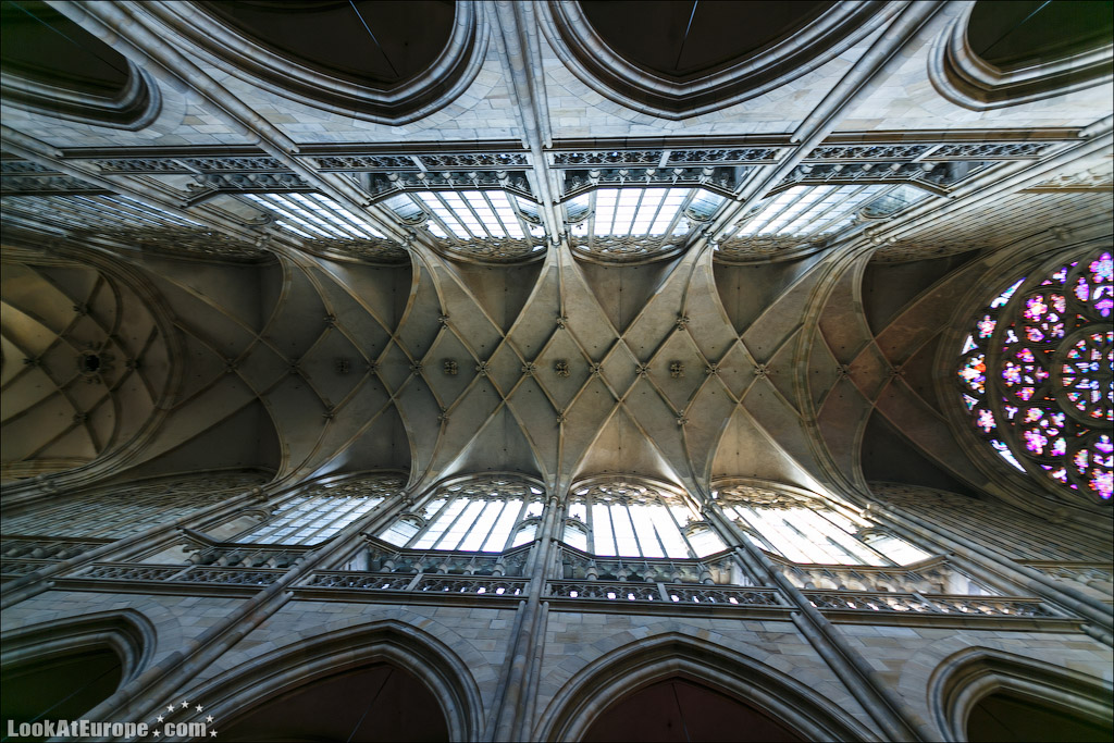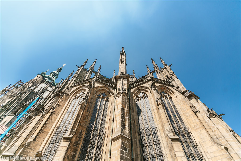 При всем величии собора Святого Вита, именно из пражского Града, где он и находится, увидеть его сложнее всего. Если проходить через вторые внутренние ворота, то собор буквально встает перед вами стеной и «заставляет» поднять взгляд почти вертикально вверх, чтобы увидеть как две 82 метровые башни упираются в небо. А обойдя собор вокруг и лишь затем войдя внутрь, вам будет казаться, что изнутри он больше чем снаружи.