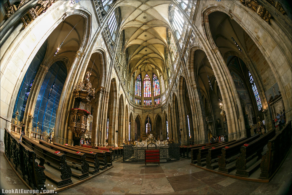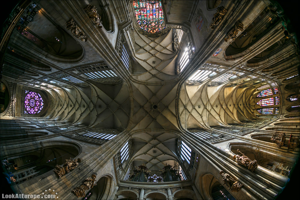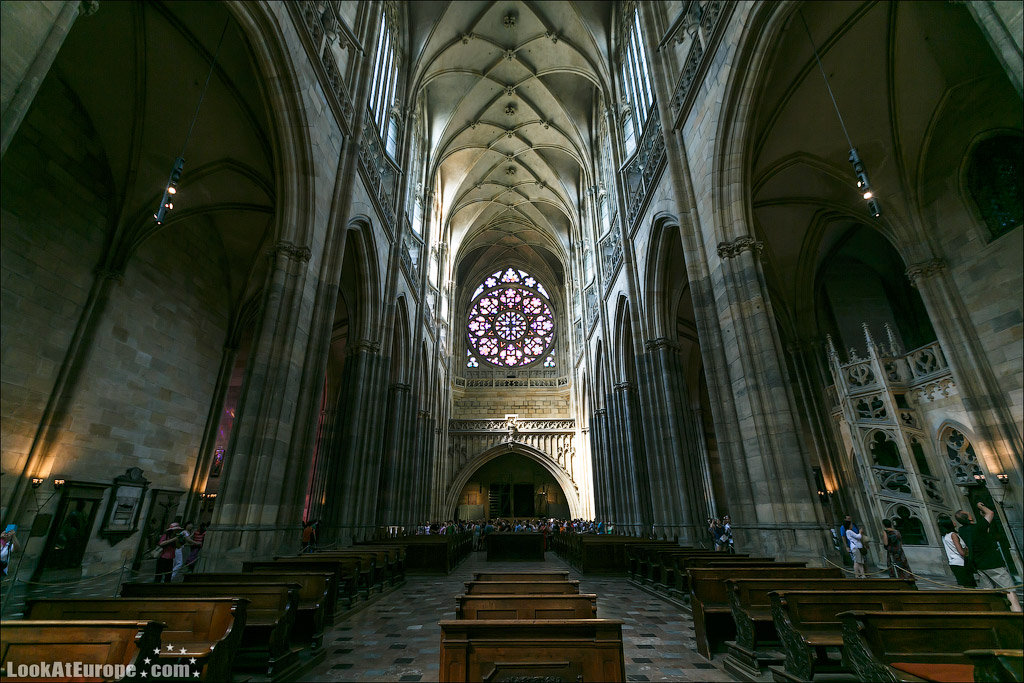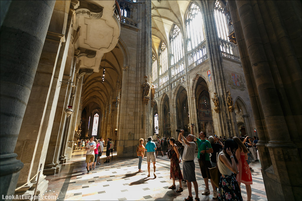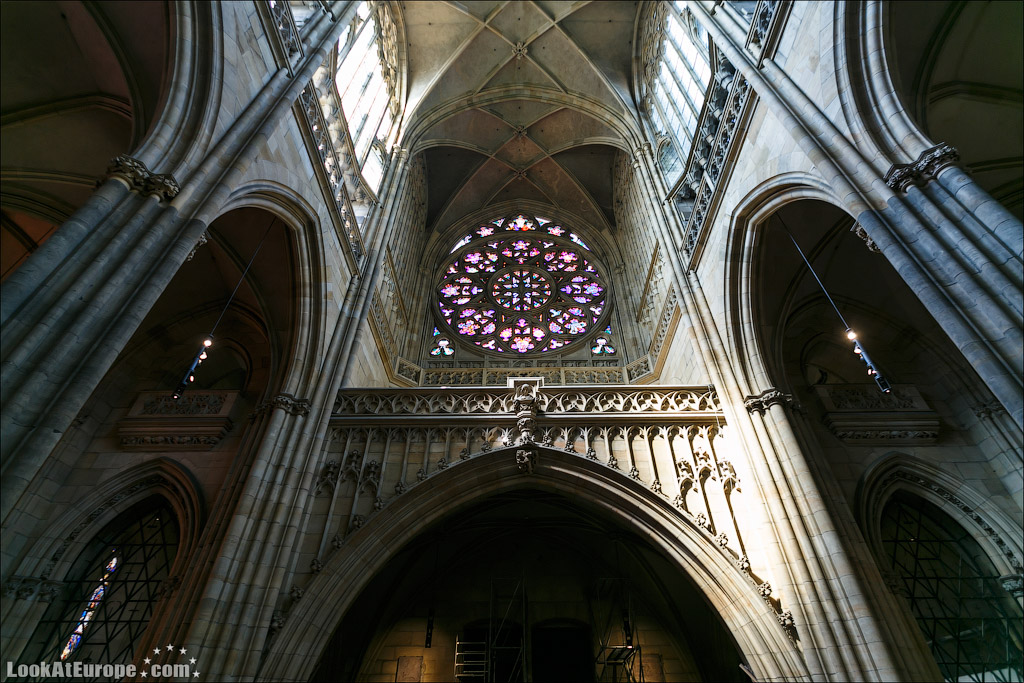 При всем величии собора Святого Вита, именно из пражского Града, где он и находится, увидеть его сложнее всего. Если проходить через вторые внутренние ворота, то собор буквально встает перед вами стеной и «заставляет» поднять взгляд почти вертикально вверх, чтобы увидеть как две 82 метровые башни упираются в небо. А обойдя собор вокруг и лишь затем войдя внутрь, вам будет казаться, что изнутри он больше чем снаружи.