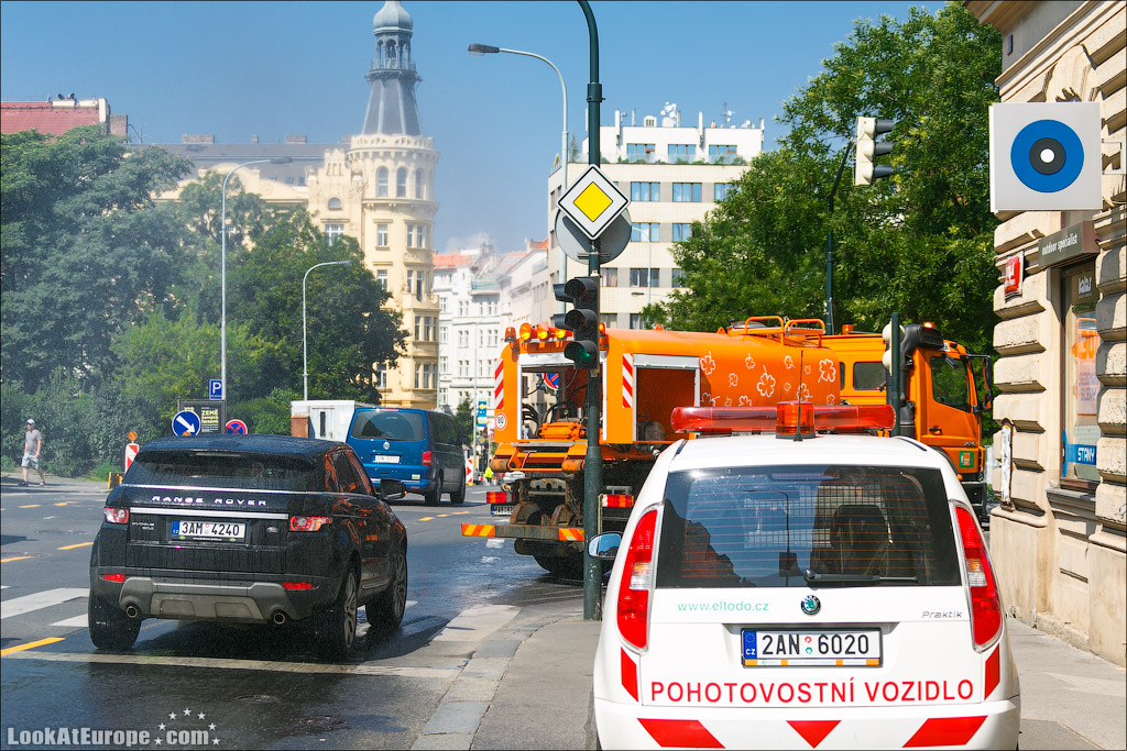 42. А по улицам Праги ездят поливальные машины. В Израиле их нет, в покинутом мной Узбекистане их тоже не особо, так что последний раз я их видел когда мне было ну лет 7-9 наверное… А вот едущий за поливалкой Range Rover тупо моет свою машину