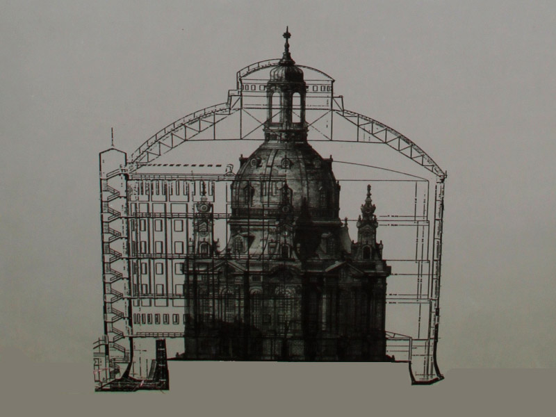 Сравнение масштабов газгольдера Эрлвайна (самого большого на предыдущем фото) и Фрауенкирхе — символа Дрездена (фото: инфостенд Drewag)