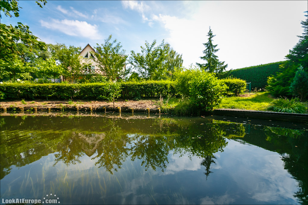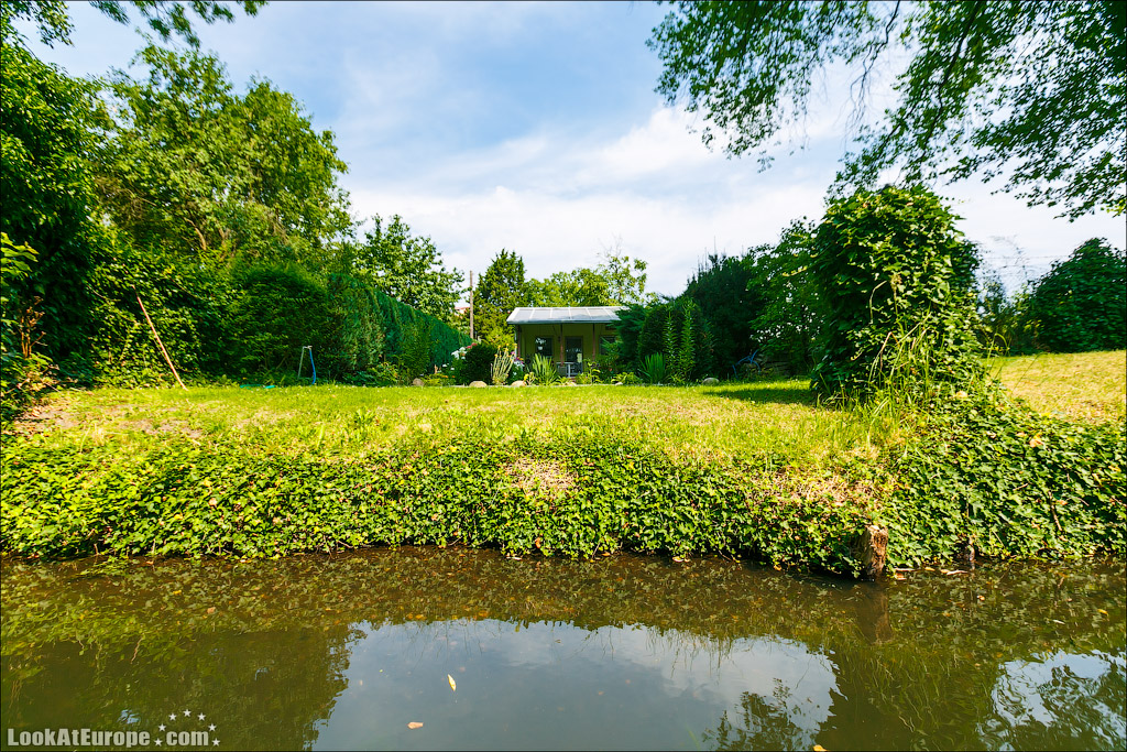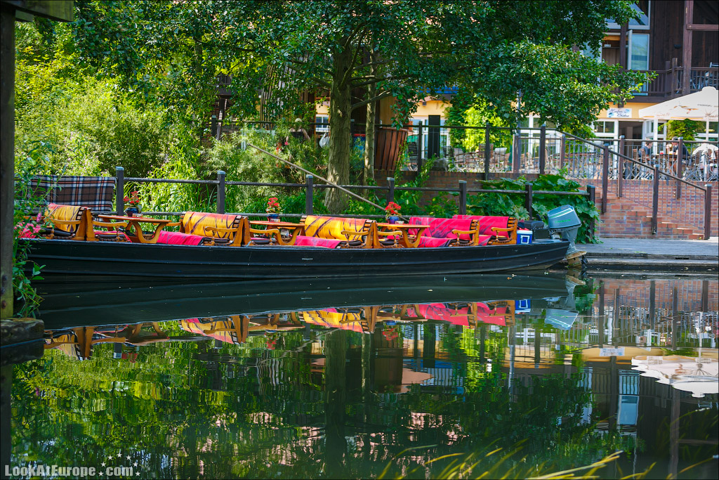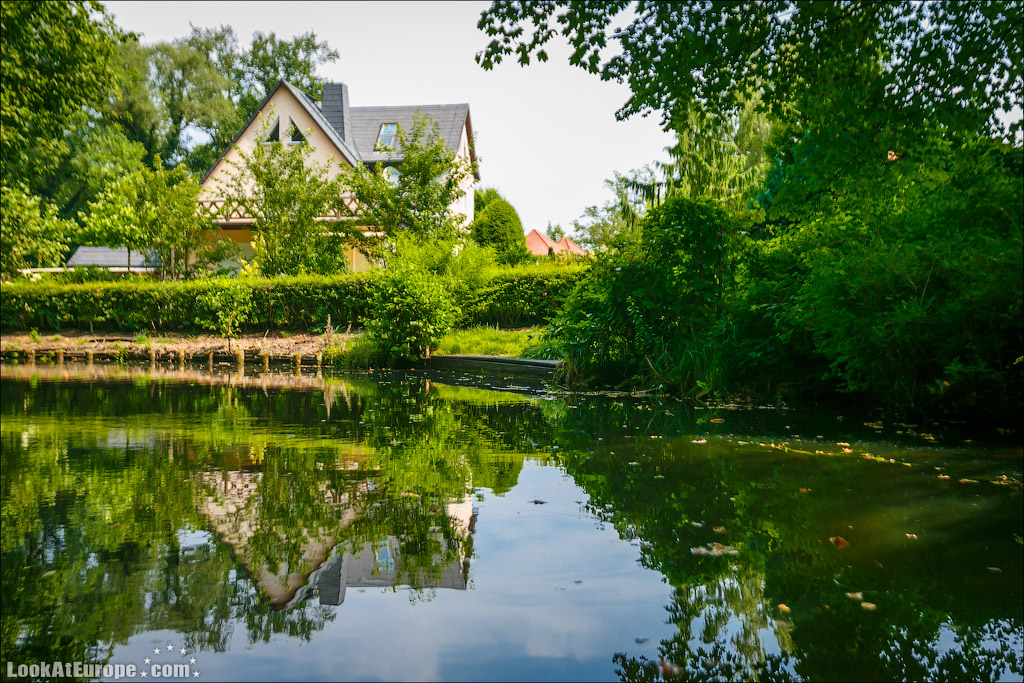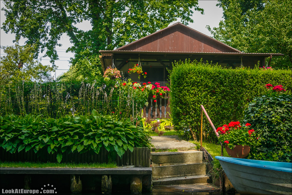 По глади каналов, одетых в берега из досок неспешно плывут большие лодки-плоскодонки; вызывая восхищенное удивление, сменяют одна другую ухоженные зеленые лужайки с разноцветными домиками; как на параде выстраиваются вазоны с геранью всех оттенков и пышные кусты цветущих роз. Прибрежные домики жителей можно назвать частью местных достопримечательностей и настоящим украшением пейзажа. Возле каждого дома есть свой причал, который хозяева украшают со вкусом и с выдумками. На каждом причале — почтовый ящик- ведь мы помним, почтальон развозит почту на лодке…Резные скамейки, зверушки, газоны и клумбы — вот все это немцы любят