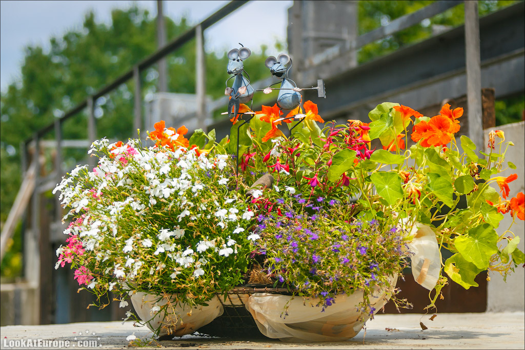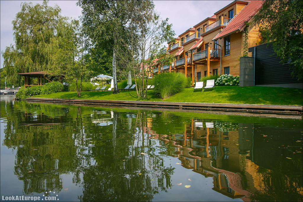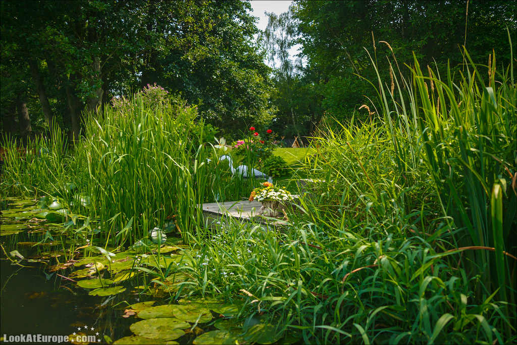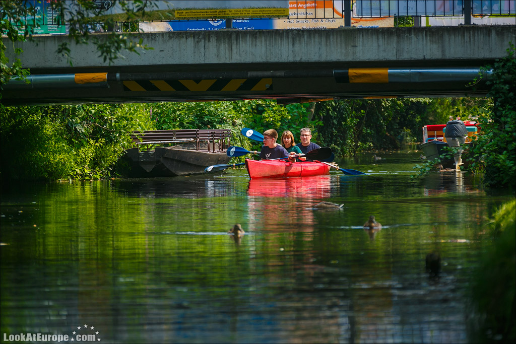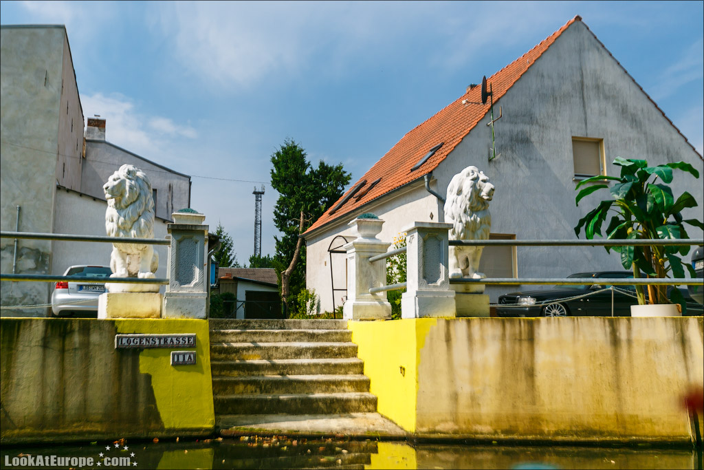 По глади каналов, одетых в берега из досок неспешно плывут большие лодки-плоскодонки; вызывая восхищенное удивление, сменяют одна другую ухоженные зеленые лужайки с разноцветными домиками; как на параде выстраиваются вазоны с геранью всех оттенков и пышные кусты цветущих роз. Прибрежные домики жителей можно назвать частью местных достопримечательностей и настоящим украшением пейзажа. Возле каждого дома есть свой причал, который хозяева украшают со вкусом и с выдумками. На каждом причале — почтовый ящик- ведь мы помним, почтальон развозит почту на лодке…Резные скамейки, зверушки, газоны и клумбы — вот все это немцы любят