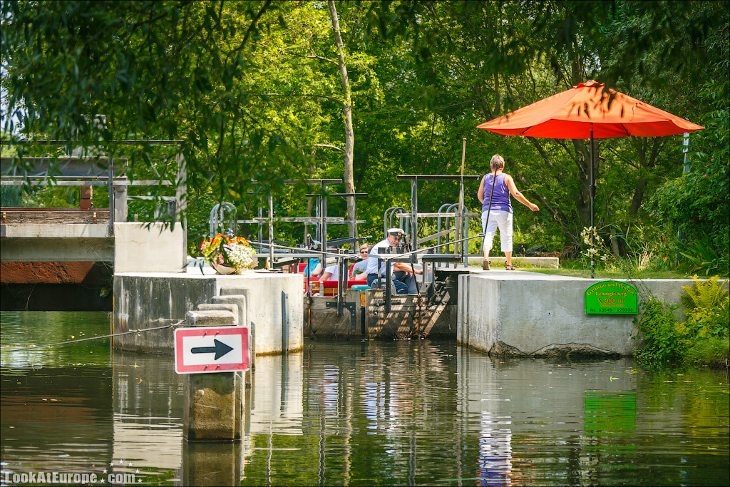 На берегах стоят настоящие «дорожные» знаки, указывающие направление, а также названия протоков, чтобы ориентироваться по карте. А карты обязательно выдаются туристам, решившим самостоятельно обследовать каналы Шпрее… Представляете, заплывет турист » не туда», ищи его потом на расстоянии 970 км.