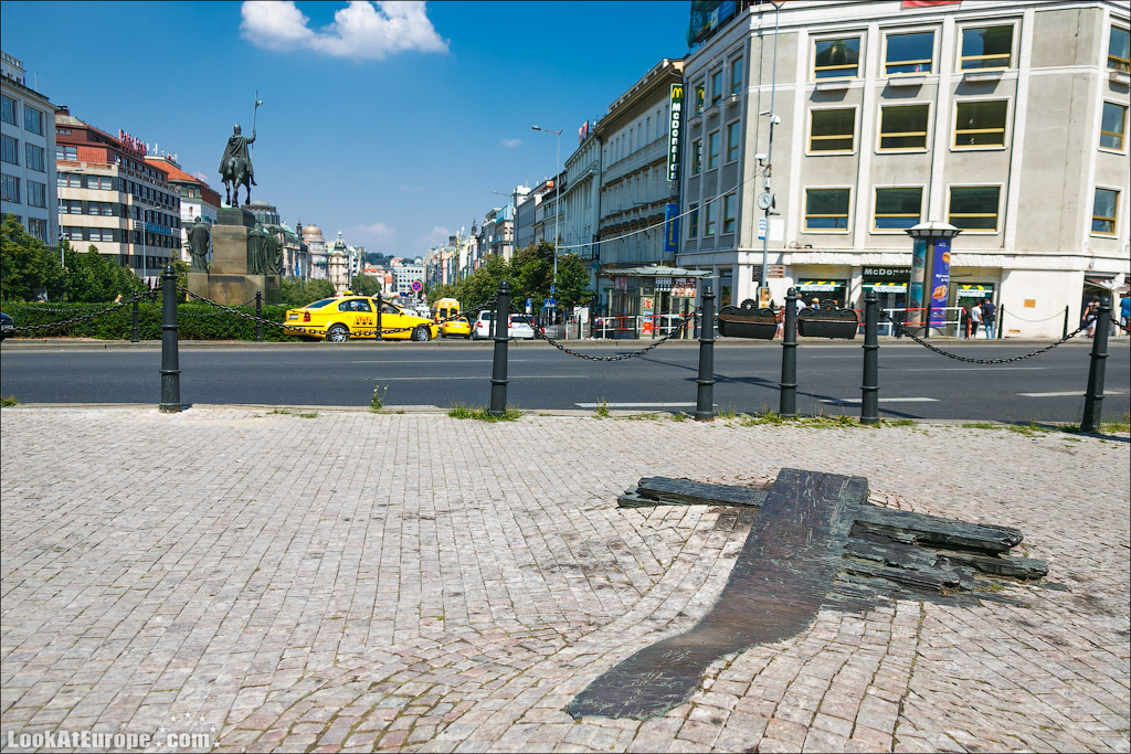 29. В 1969 г. на Вацлавской площади произошел ряд публичных самосожжений. Первым стал студент Ян Палах, который тем самым хотел выразить протест против оккупацией странами Варшавского договора его родной Чехословакии. Затем этот эксцентричный жест повторил уже другой студент — Ян Зайиц. Сжег себя он в годовщину коммунистической революции. В память об этих событиях в 1989 г. на площади был установлен крест.
