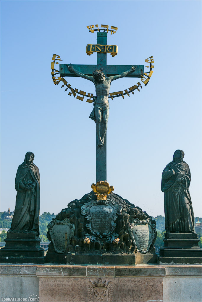17. Одна из первых и самых больших статуй Карлова моста — «Распятие» Выполнена скульптором В. Броном в 1629 году. Распятие стоит на месте креста XIV века, изначально стоявшего на Карловом мосту. На скульптуре есть надпись на иврите, восхваляющая Христа. Эта надпись имеет интересную историю – она была сделана в 1696 г. в виде штрафа, взятого с еврея, который богохульствовал рядом со статуей. Об этом напоминает прикрепленная рядом табличка. Скульптурная группа Святого Креста – одна из немногих, сделанная из бронзы. Христос находится в окружении скульптур Иоанна Евангелиста и святой Анны.