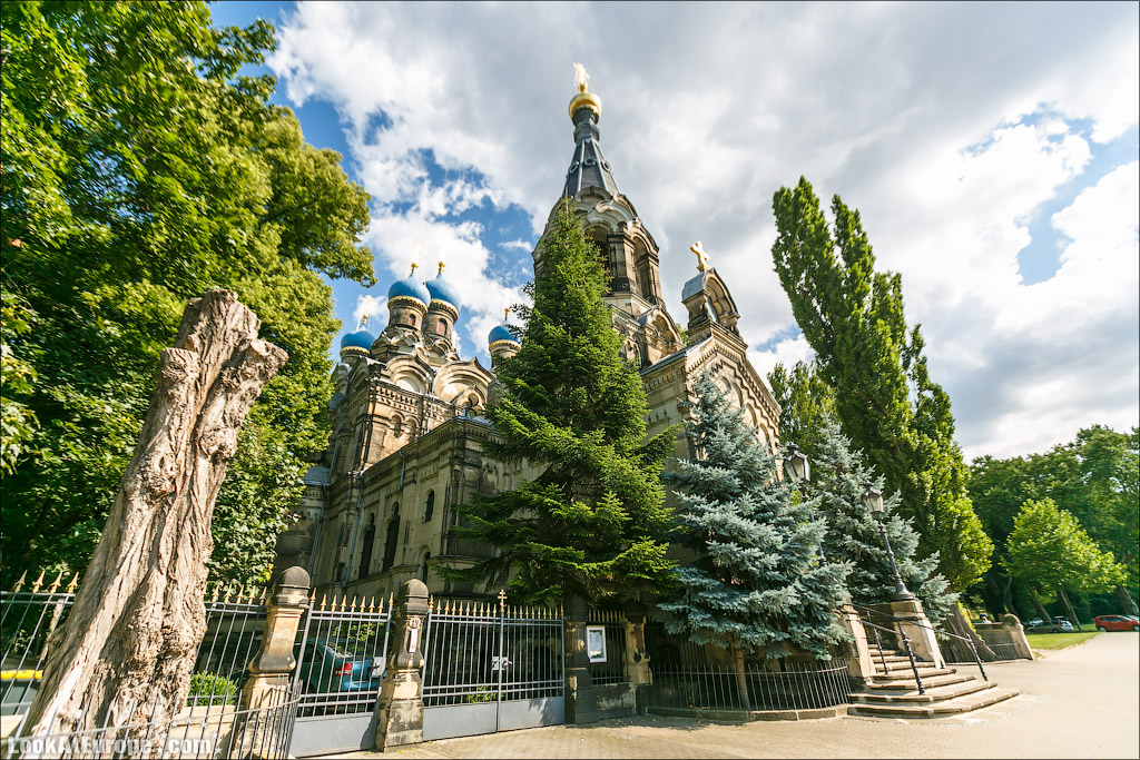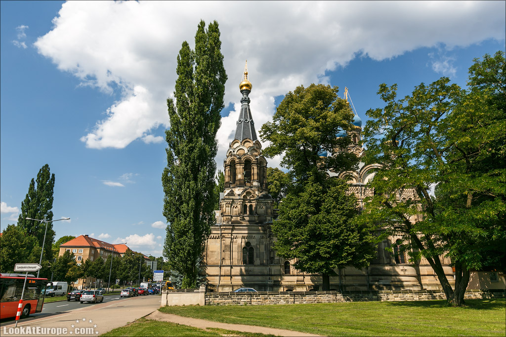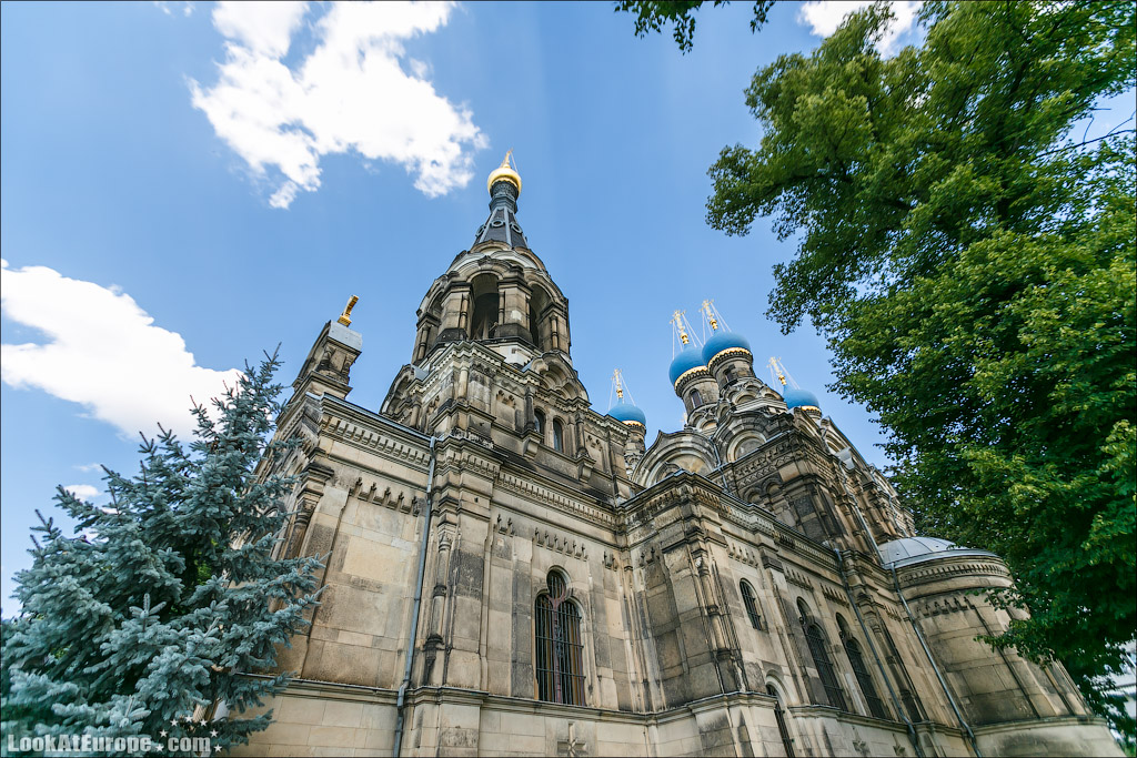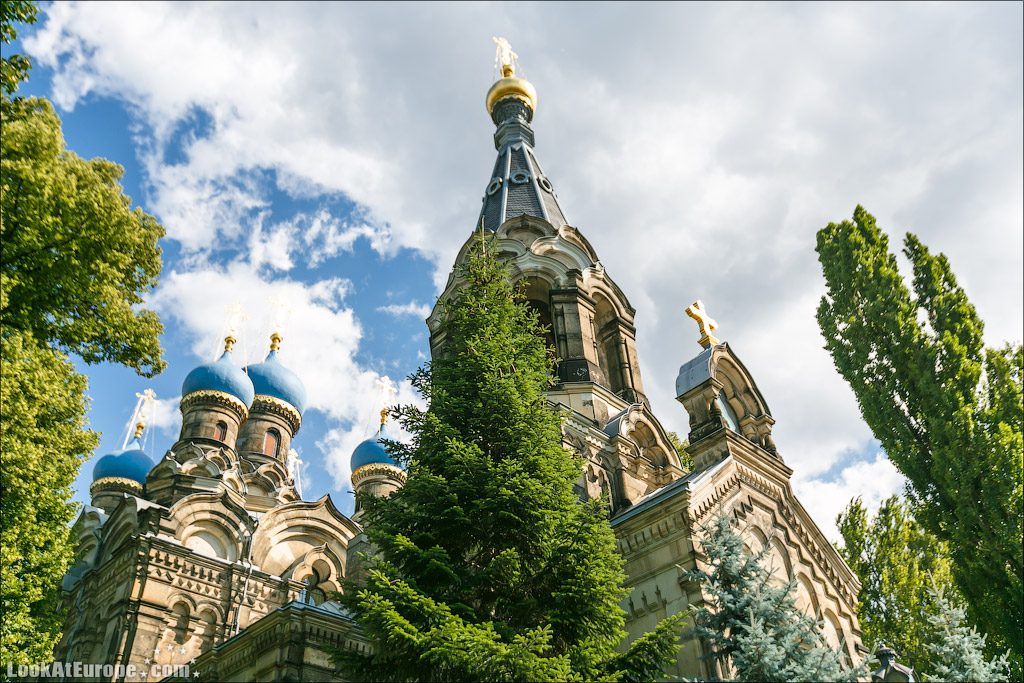 В пяти минутах пешей прогулки от главного железнодорожного вокзала Дрездена и 15 минутах от Старого города (Альтштадт) находится Русская Православная Церковь — Храм святого Симеона Дивногорца. LookAtEurope.com - Фотогалоп по Европе. Чехия, Германия, Голландия Пять голубых куполов-луковок, с позолоченным крестом на каждом символизируют Христа и четырех евангелистов. Пройти здание и не заметить будет очень сложно.