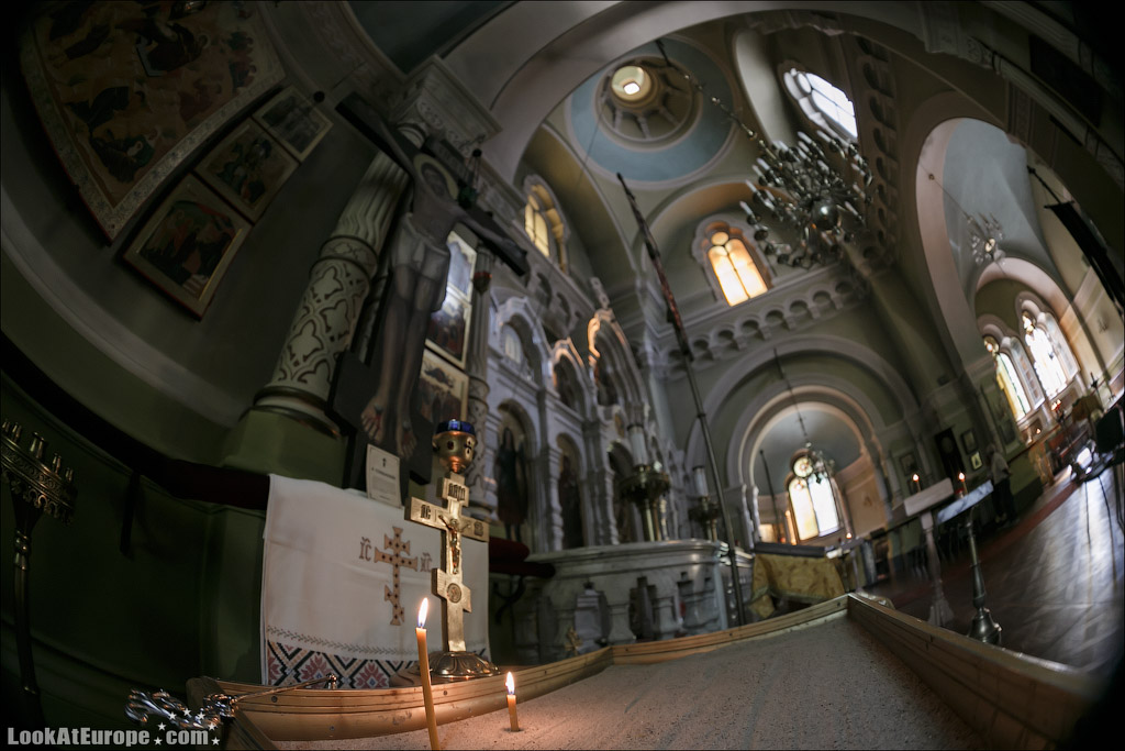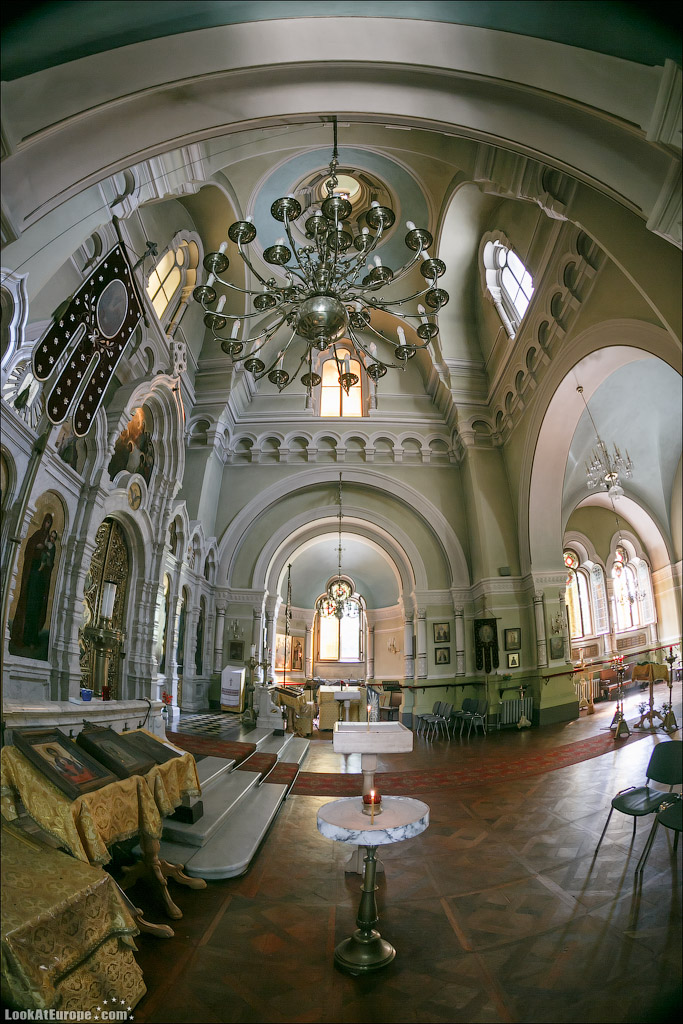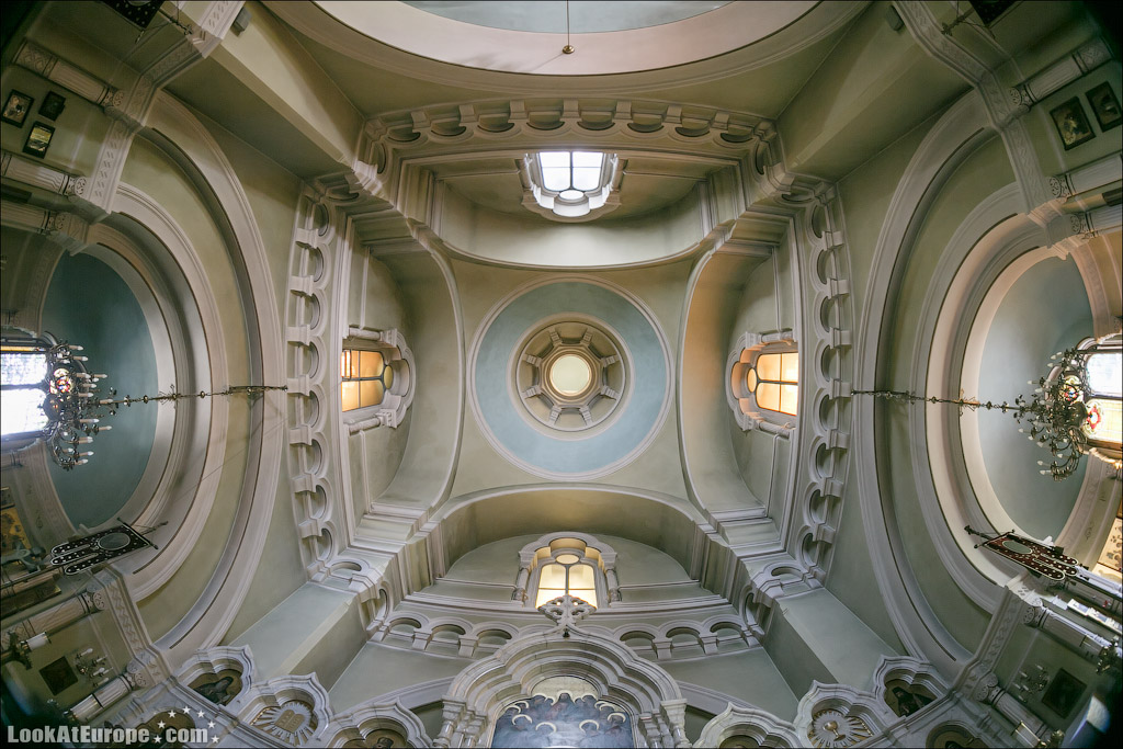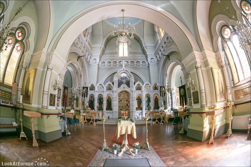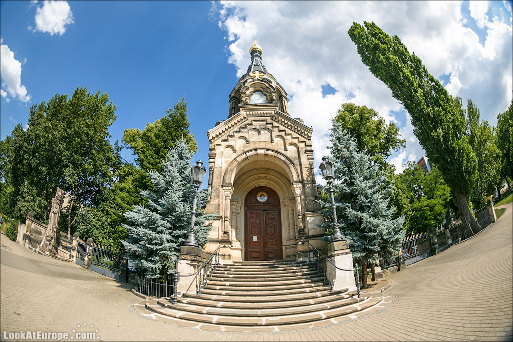В пяти минутах пешей прогулки от главного железнодорожного вокзала Дрездена и 15 минутах от Старого города (Альтштадт) находится Русская Православная Церковь — Храм святого Симеона Дивногорца. LookAtEurope.com - Фотогалоп по Европе. Чехия, Германия, Голландия Пять голубых куполов-луковок, с позолоченным крестом на каждом символизируют Христа и четырех евангелистов. Пройти здание и не заметить будет очень сложно.