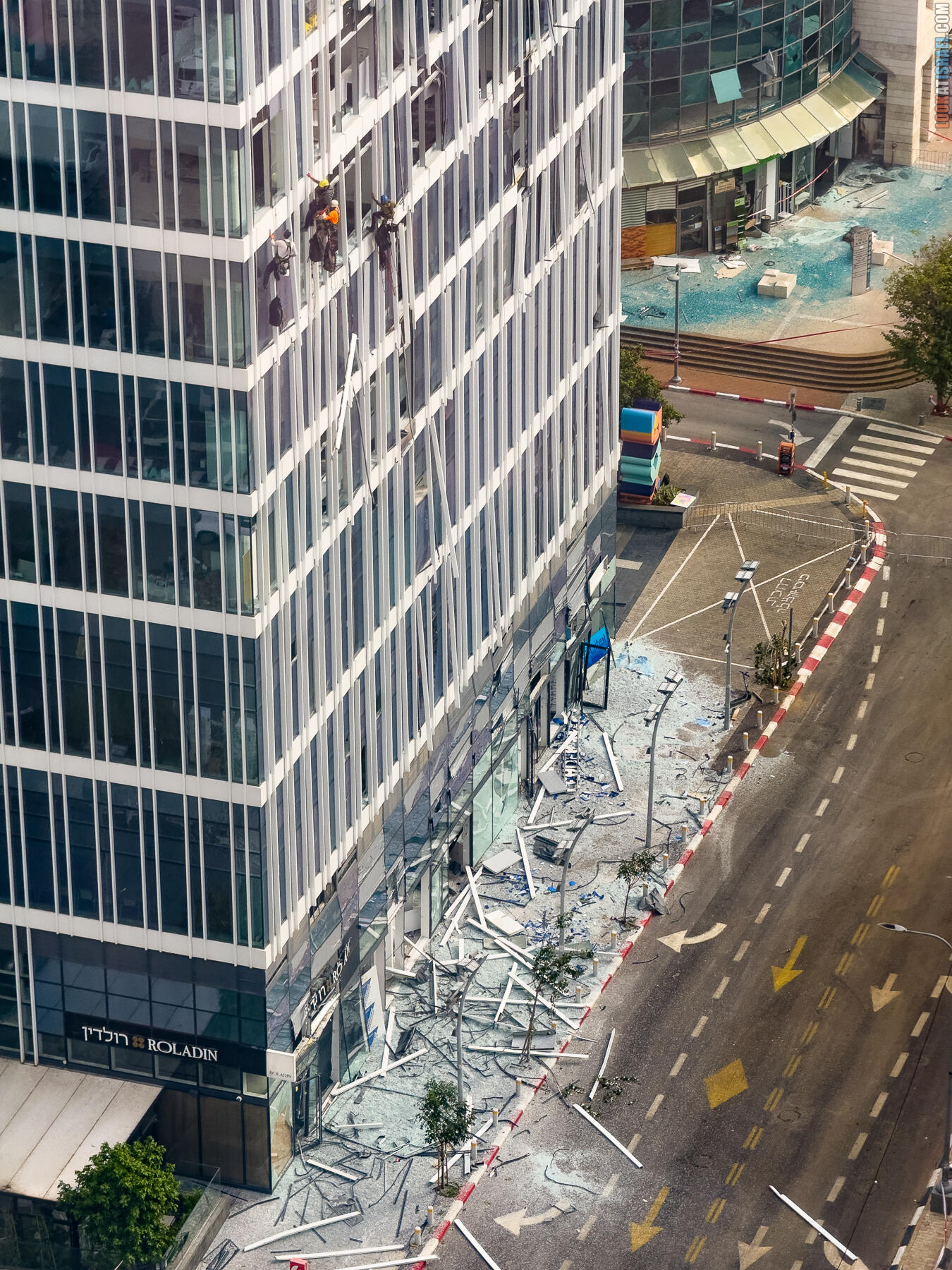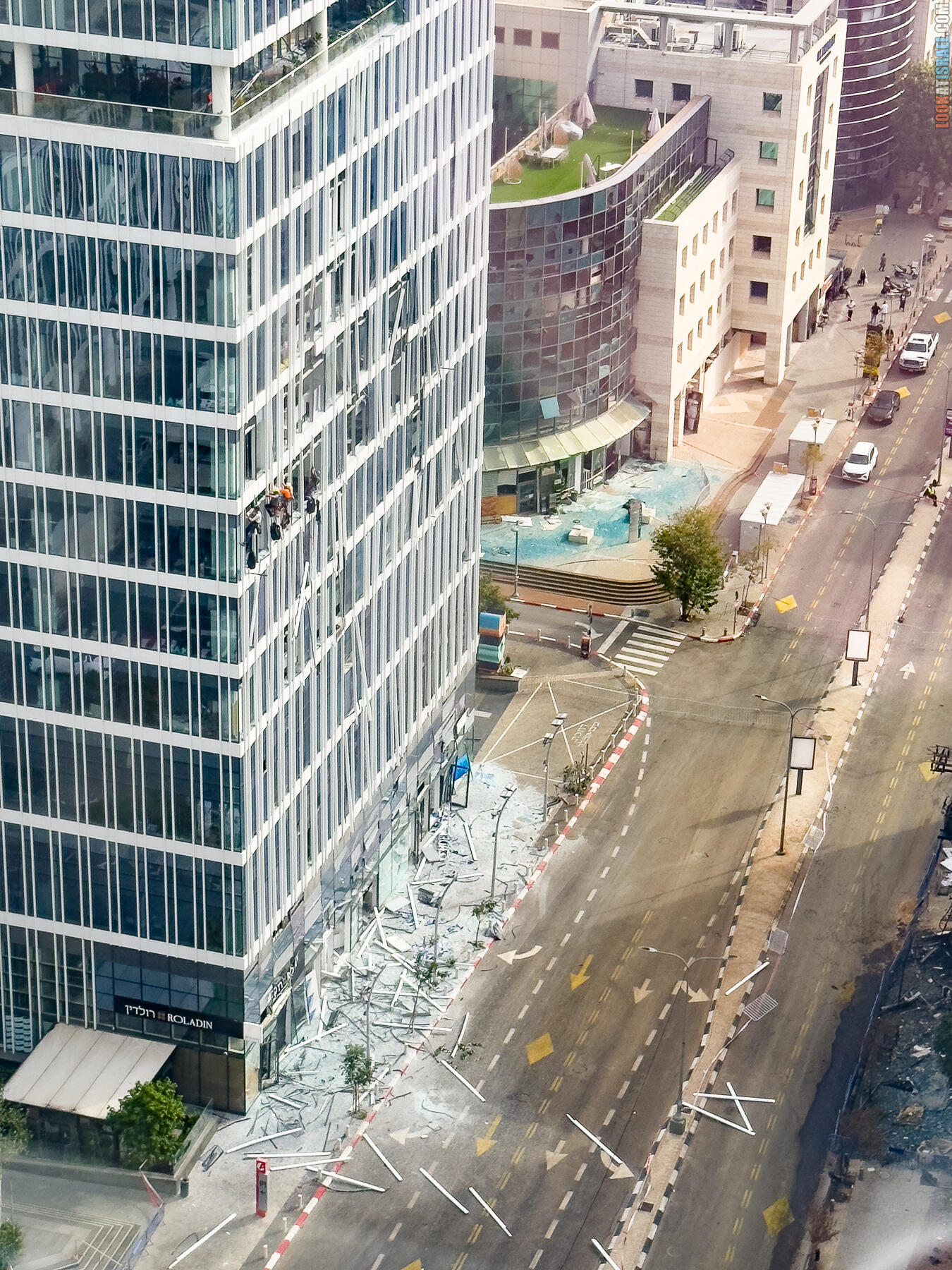 На двух этажах выбиты окна и повреждена облицовка. Магазинам внизу тоже причинен значительный ущерб. Теперь промышленные альпинисты скидывают вниз все, что плохо держится, а фотографии нажимабельны