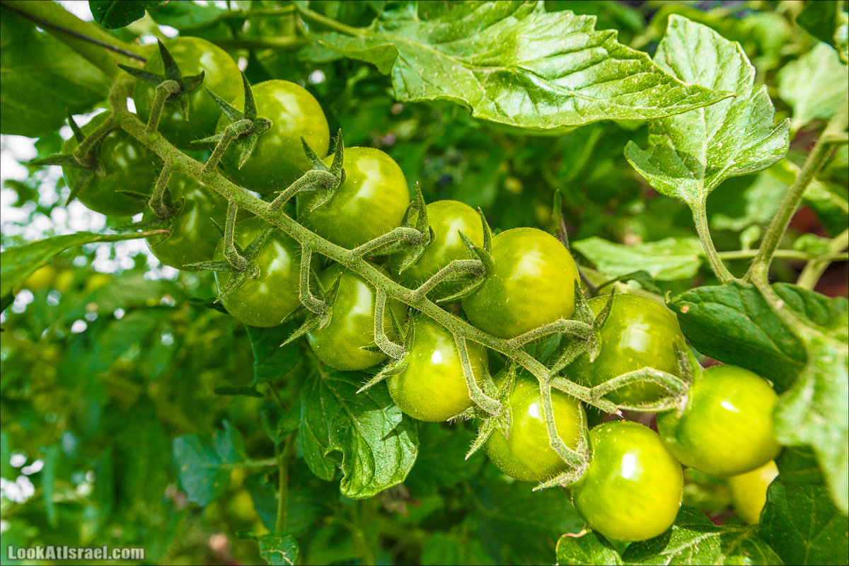 Сельскохозяйственная школа Хава бе-Еден | Hava be-Eden farm | LookAtIsrael.com - Фото путешествия по Израилю | חווה בעדן Как вам такая идеальная гроздь помидоров,  что на фото? Помидоград прям! Или винодор? А теперь представьте кусты высотой под два с половиной метра, увешанные такими кистями. Это еще не все — на грядке справа баклажаны круглые, баклажаны полосатые, на грядке слева кабачки белые соседствуют с перцем всех возможных цветов и уровней остроты. А внизу на пакетах с водой растет базилик обычный, базилик красный, клубника обыкновенная, кудрявая капуста и съедобные цветы. Добро пожаловать на «Ферму в раю — Хава бе-Эден»