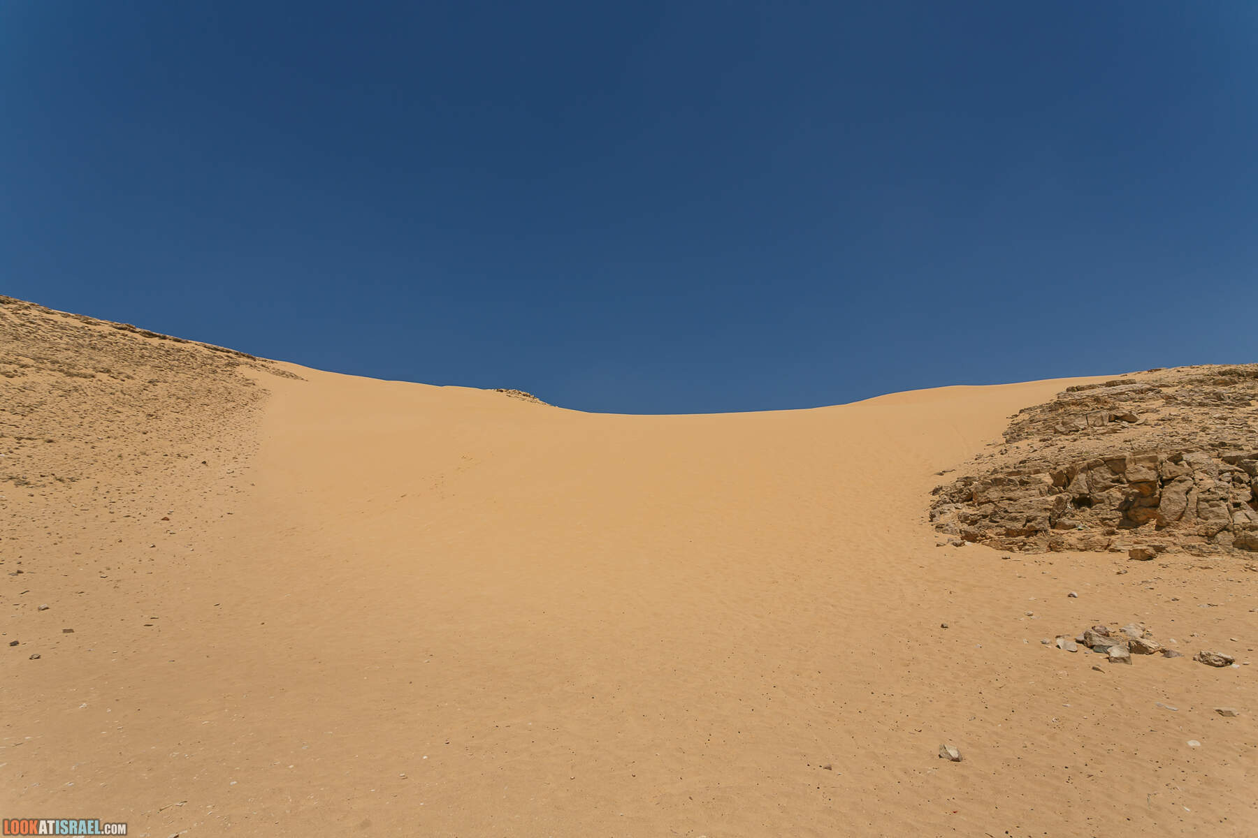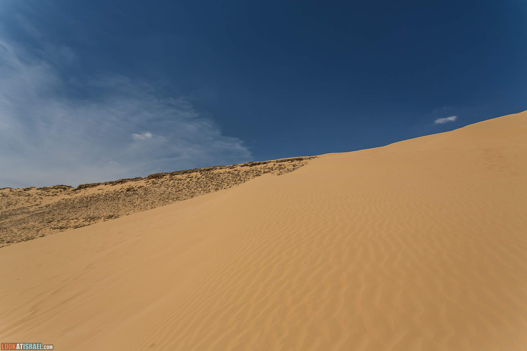 И правильно не верил! Потому что есть! Если ехать в Эйлат не стандартными путями и не бояться легкого бездорожья, то вполне можно сползая вниз карабкаться по осыпающемуся склону, походить по гребню дюны, съехать на пятой точке по песку как по снегу, насладиться сочетанием желтого и голубого. Ну, а если есть желание, то тут же можно поставить палатку (вполне законно) и насладиться звездным небом.
