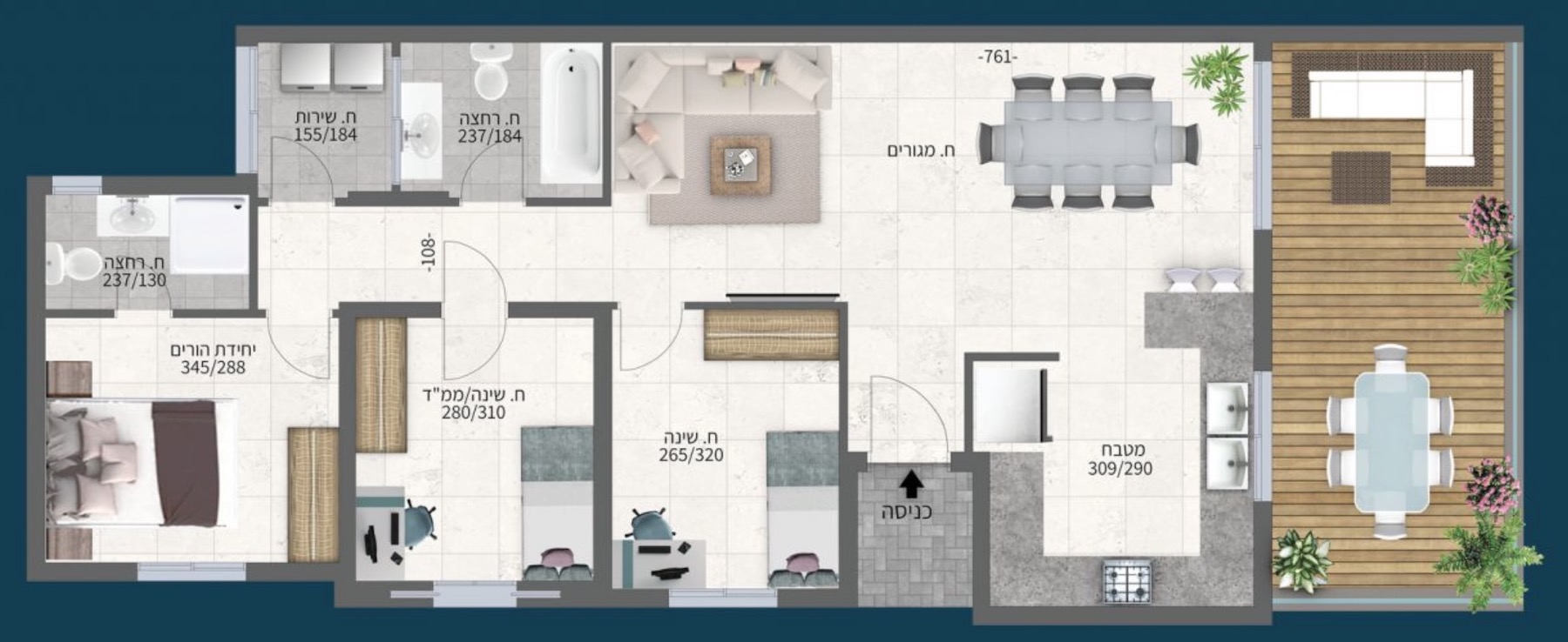 Существует два варианта их постройки и приобретения. При первом строят только верхний (входной) этаж, на котором будут балкон, кухня, салон с обеденной зоной (ака «пинат охель», три комнаты, одна из которых со своим санузлом (родительская спальня), ещё один санузел и подсобная комната для стиральной и сушильной машин.
