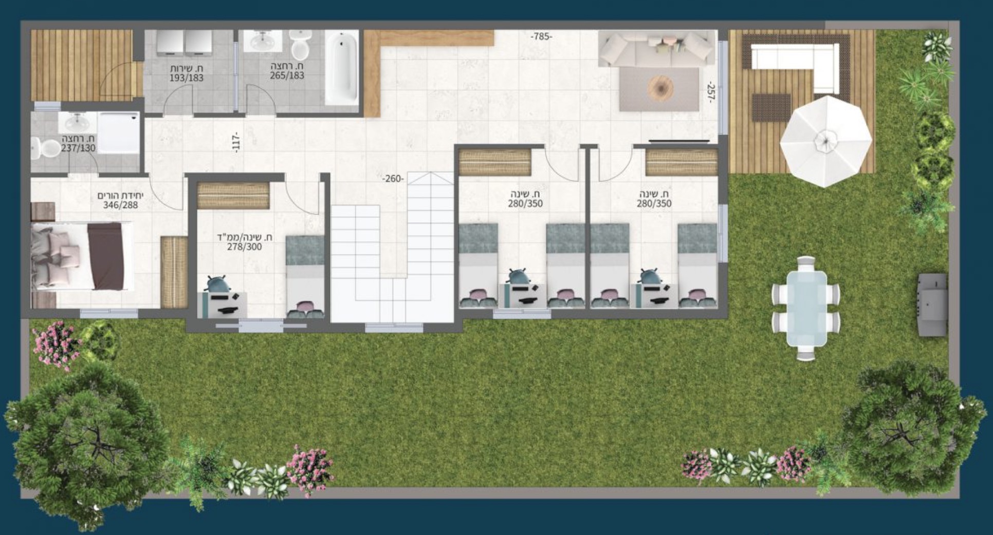 Таким образом, при выборе варианта с полной застройкой мы получаем два этажа примерно по 100 метров2 каждый и двор в 165 м2. На каждом этаже одна из комнат — это бомбоубежище (aka מקלט), а рядом с домом находятся две личные стоянки.