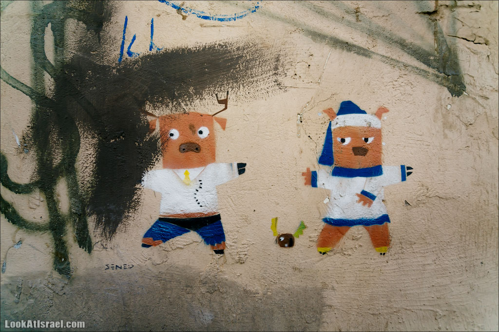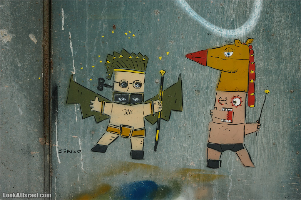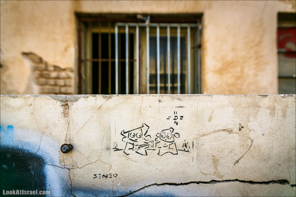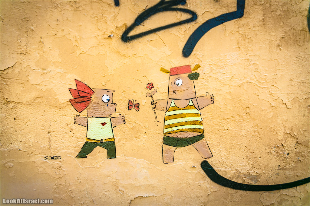 Из всех граффити Тель Авива моими любимыми являются ha-Куфсоним (הקופסונים). Именно так они называются на иврите. А перевести на русский можно как «Коробченки» или «Коробчата». А все потому, что их прообразом была обычная коробка. Их отец-родитель Adi Sened, «расселяет» своих героев на стенах кварталов Неве Цедек, Флорентин и прилегающих улицах.