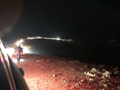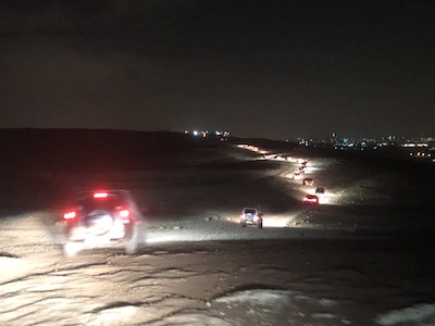 Не думаю, что вы когда-нибудь стояли в пробке…. в пустыне! Длинная вереница внедорожников всех цветов и мастей медленно двигалась по узкой дороге. Наверняка сверху, эта змея огней выглядела не менее впечатляюще чем свечи на склонах.