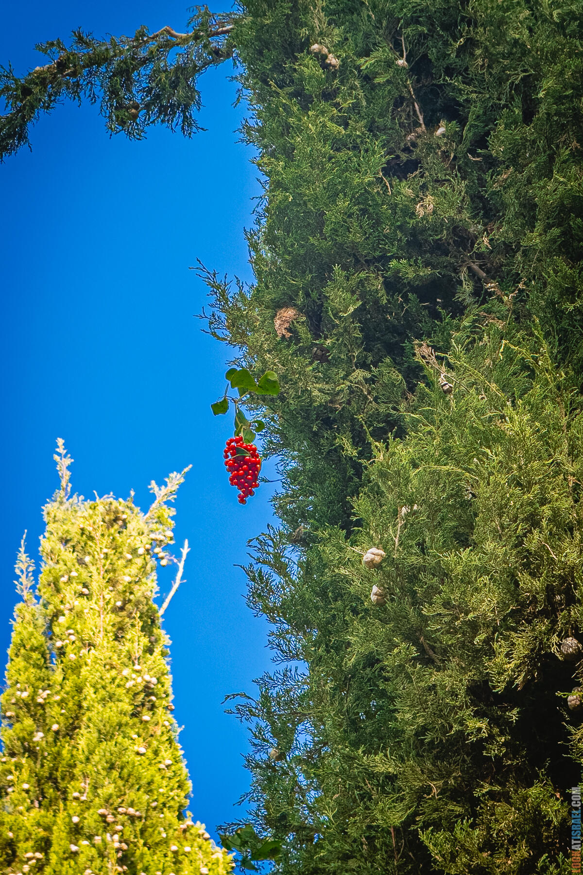 Надеюсь, что насчет калины вы прочитали прошлую ссылку, я пока обращу ваше внимание на эти хвойные деревья, которые словно ракеты стремятся ввысь. А одно из них даже плодоносит красными ягодами, чего быть не может