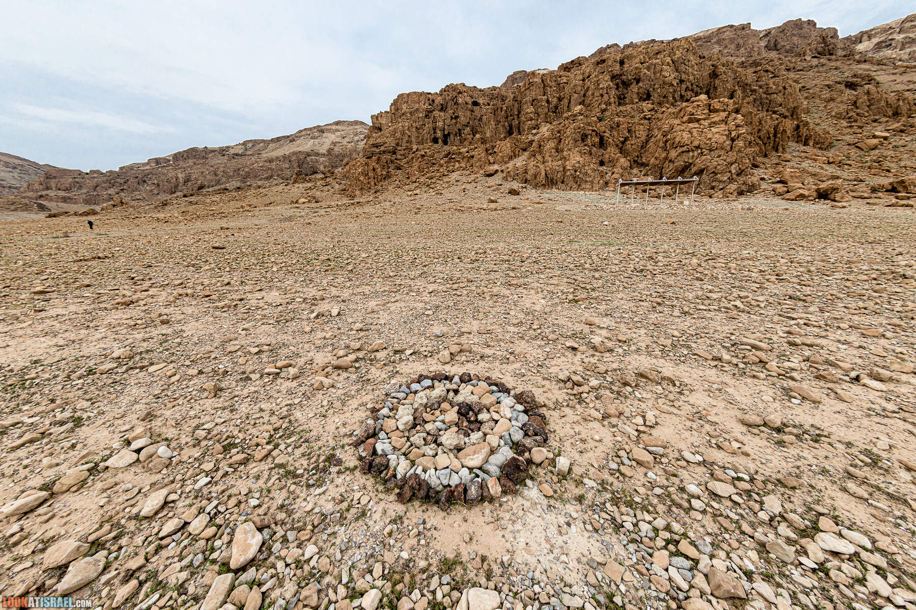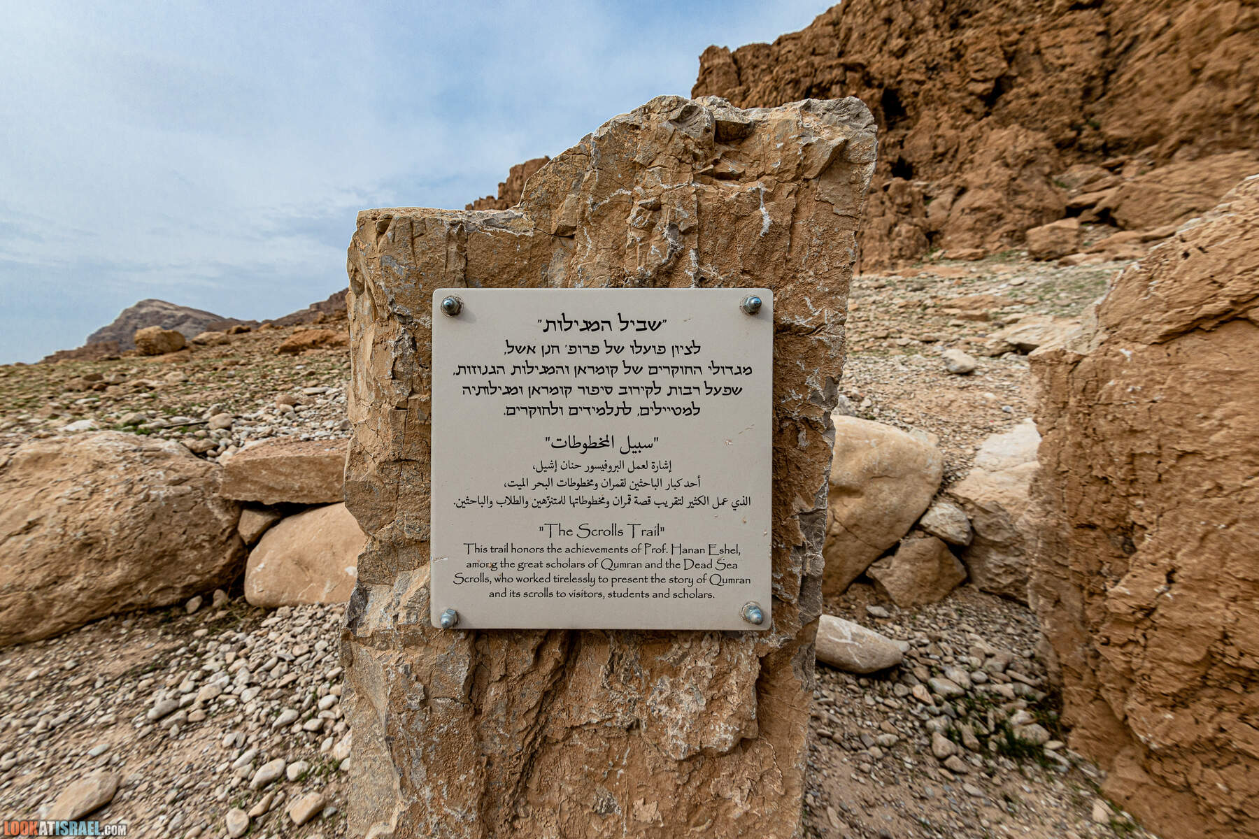 Здесь же установлен памятный камень профессору Ханану Эшель, посвятившему свою жизнь поиску и изучению кумранских свитков.