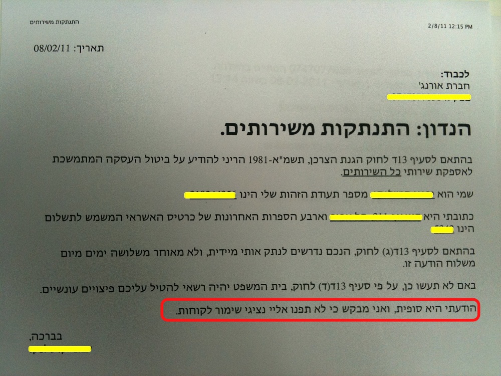 После этого вы получите на электро-почту подтверждение отправки факса. Кстати судя по тому что в тексте СМС есть порядковый номер, то за 15 минут работы сайта им воспользовалось 234 человека. Не плохо а? Теперь ждете три рабочих дня. В течении которых события могут развиваться по одному из трех сценариев Первый: вас не отключили и вы идете в суд и бла-бла-бла… Второй: Вас отключили и вы счастливы Третий….Обратите внимание на последнюю строчку в факсе. Это красная тряпка для быка! Это прямое указание фирме-угнетателю вам перезвонить! :-) Именно это я и ожидал от них…. Сегодня в 9:01 мне перезвонили из ORANGE. Это был мой второй разговор в жизни с представителем компании и первый по телефону. За 5 с лишним лет! Они ни разу, никогда, мне не звонили с целью что либо изменить или предложить какую-нибудь программу (не обязательно более лучшую или дешевую). Конечно с одной стороны это можно записать им в плюс, с другой стороны cellcom мне звонит иногда и что то предлагает. В итоге цена, которую я плачу cellcom потихоньку снижается… Но вернмся к разговору. Конечно долго извинялись и говорили что я «лакуах ватик» и очень им дорого. Что они не правы брать такие деньги за НИЧТО и будут винить себя в этом всю жизнь. И вот прям сейчас нажмут на главную кнопку и я перестану быть их клиентом и жизнь им станет не мила. Но если все таки я дам им секундочку чтобы они смогли попробовать реабилитироваться….. И в итоге этой секундочки я получил: