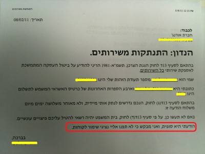 2. Тескт сгенерированного документа публиковался на сайте Ynet в придачу со всеми факсами и телефонами всех вражеских фирм. Кто-то молодец придумавший сайт с генерацией документа за шекель. Шекель по-сравнению с грядущими убытками ничто. С ним охотно расстануться куча людей. Нужный номер факса кстати легко выясняется в ширут лакохот вражеской фирмы у первого же ответившего. У меня этот тескт лежит в ворде в доступном месте.