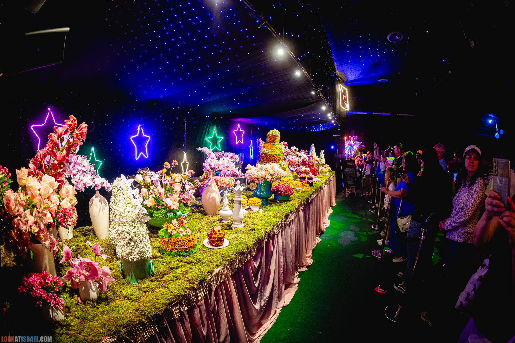 На протяжении 3-дней два дизайнера расставляли 4 с половиной тысячи цветов на этом столе. Выглядит красиво.