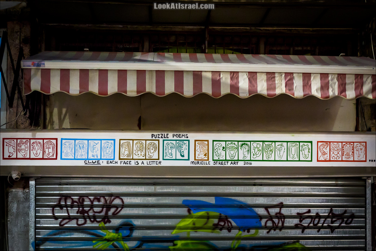 Совсем недавно я рассказывал о Мюриелле Коэн, которая украшает стены Тель-Авива своими необычными работами. Однако тогда я не упомянул, что помимо серии ретро-танцовщиц, 30-секундных портретов и «второй жизни всего» она еще и пишет стихи головоломки. На фото одна из таких работ. Сможете прочитать?