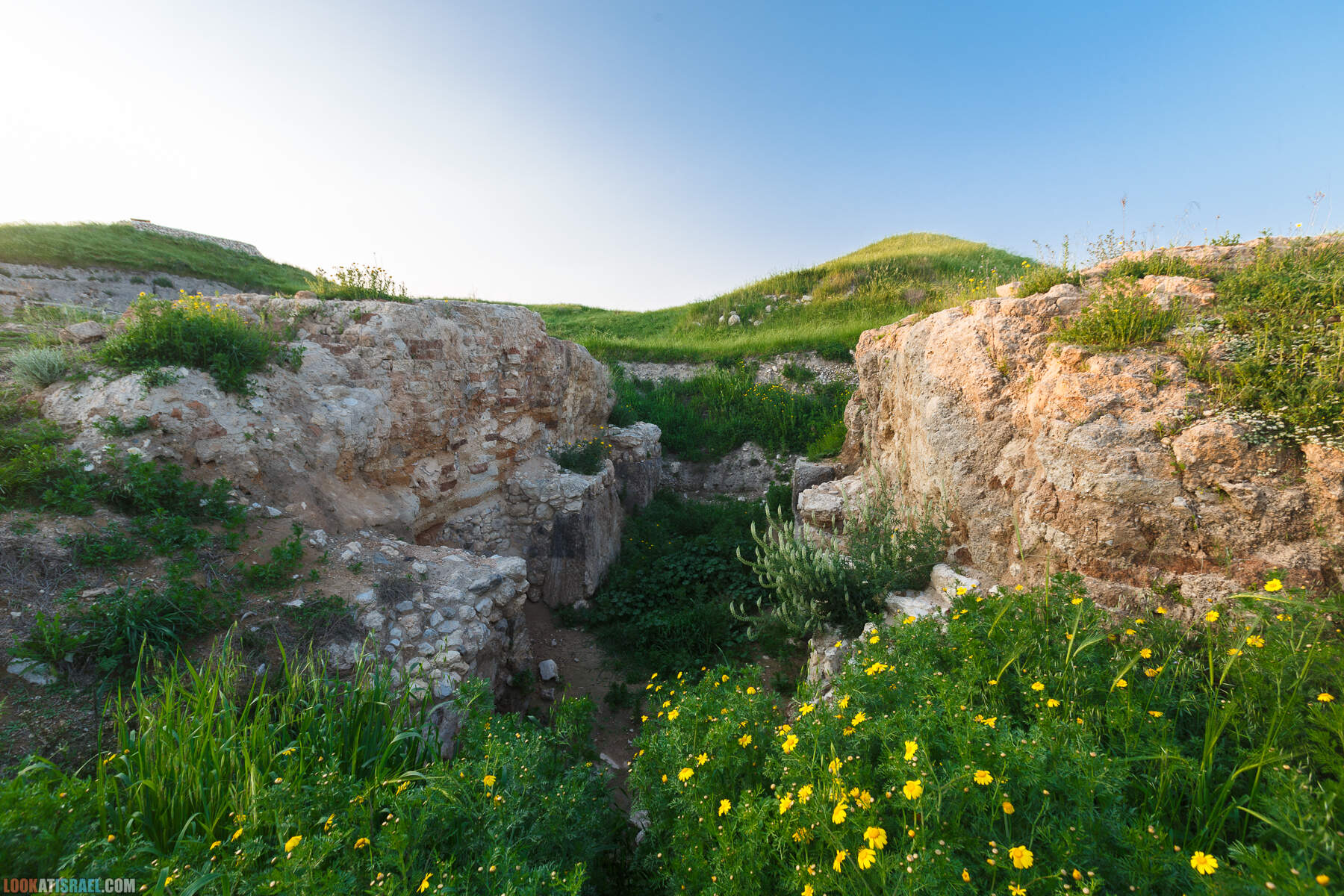 Остатки Ханаанских ворот, которые были были объеденены с городской стеной