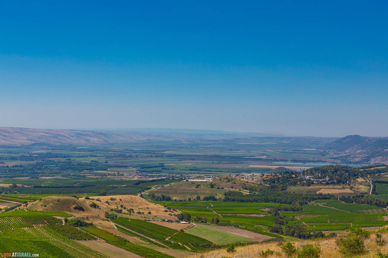 А вдали Голанские высоты и их самые заметные вулканы — Авиталь, Бенталь, (справа-налево), а в левой части гора Хермонит.