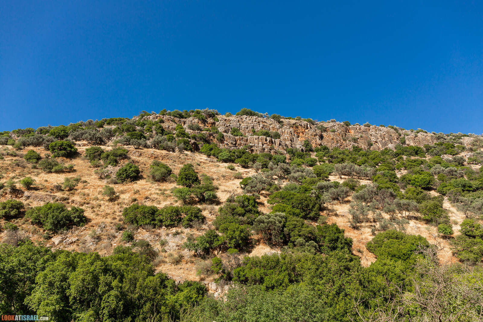 Далее наш путь лежал в нижнюю часть русла ручья Дишон, бегущего между горой Яхмур (на фото внизу), высотой 500 метров над уровнем моря и равниной Альма, где находится самая глубокая карстовая пещера в Израиле. О том как я спускался в эту пещеру читайте тут.