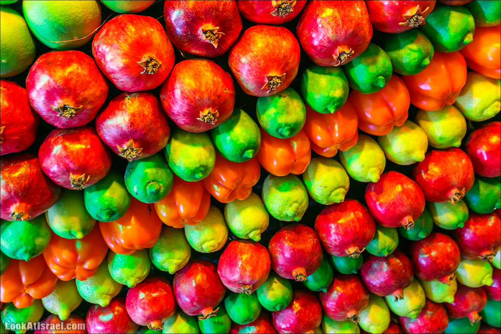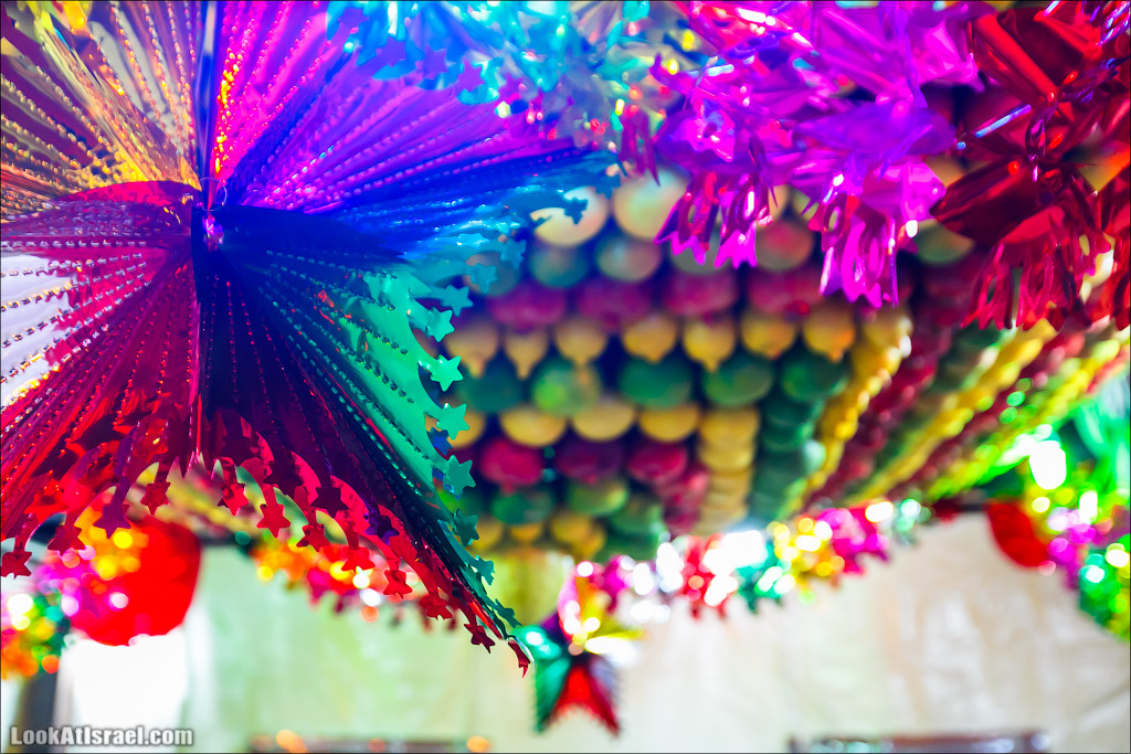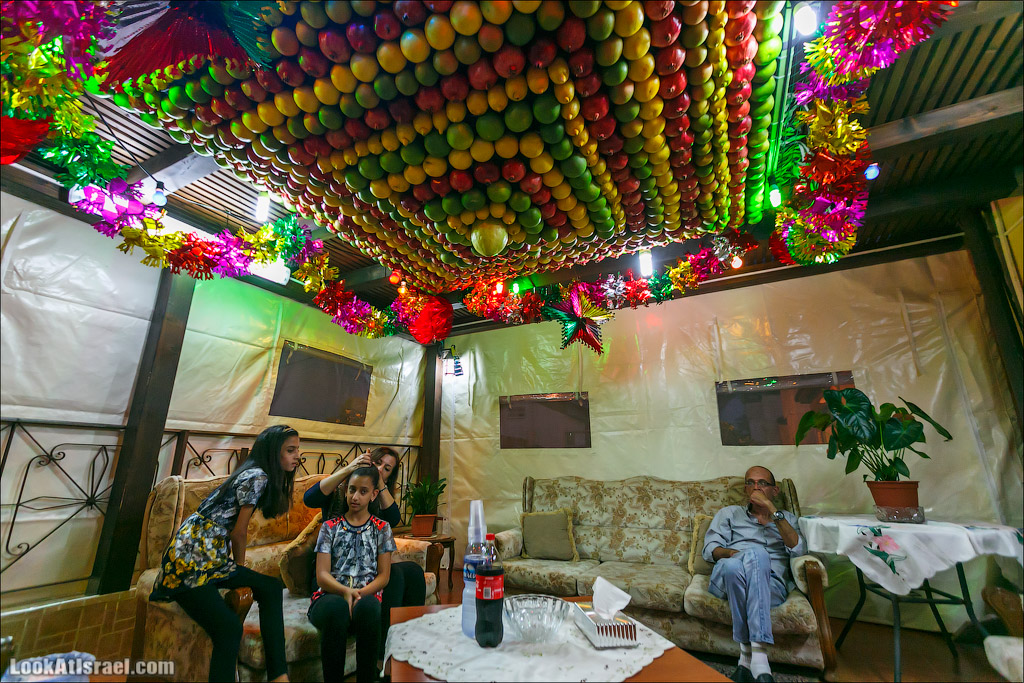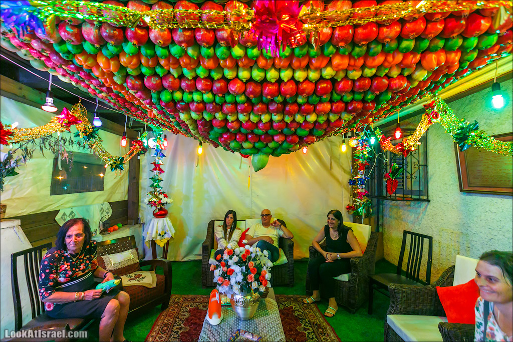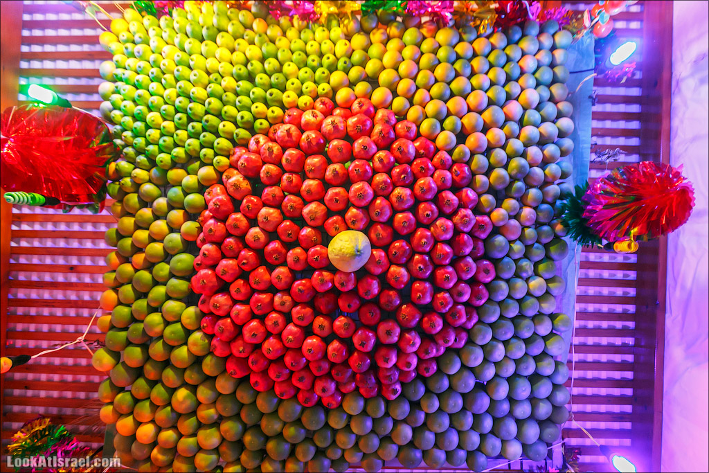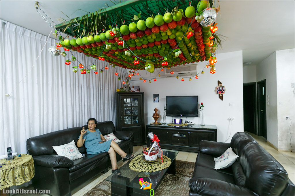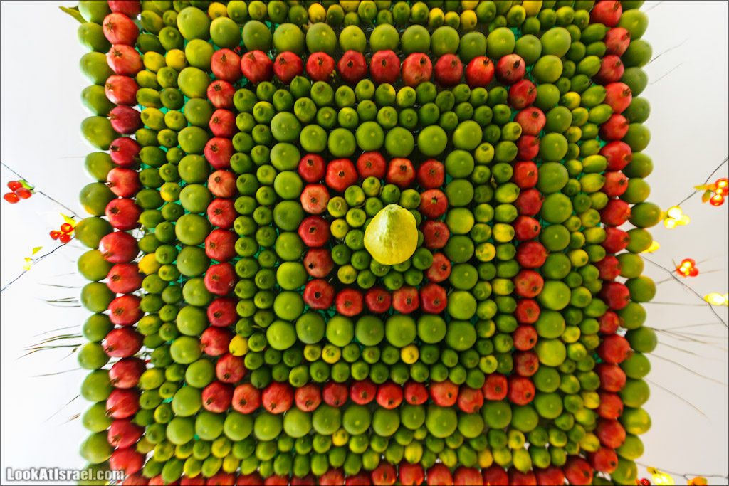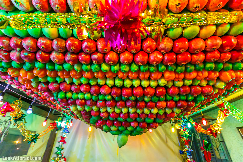 Как правило, для украшения используются гранаты, лимоны, грейпфруты и этрог. Однако в этом шалаше был и оранжевый сладкий перец!