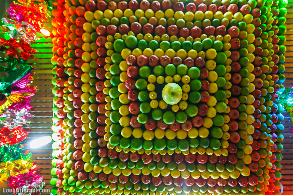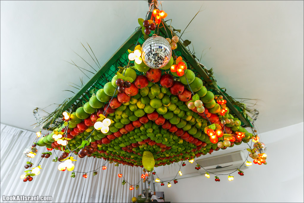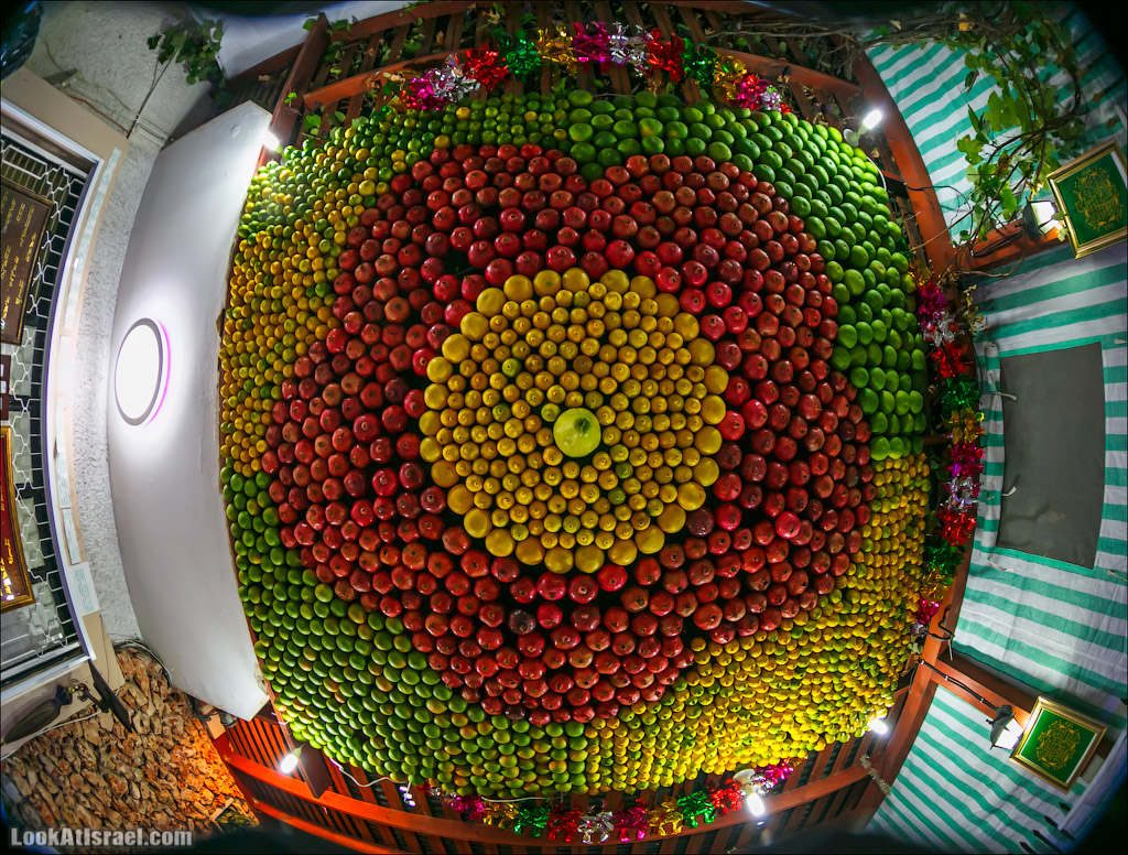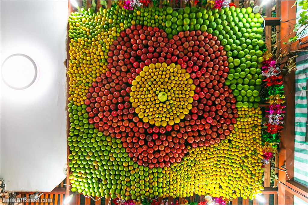 Еще один дом, еще одна уникальная сукка. Кстати, весит такая плодово-овощная конструкция почти тонну, а после праздника все фрукты идут или на варенье или раздаются желающим.