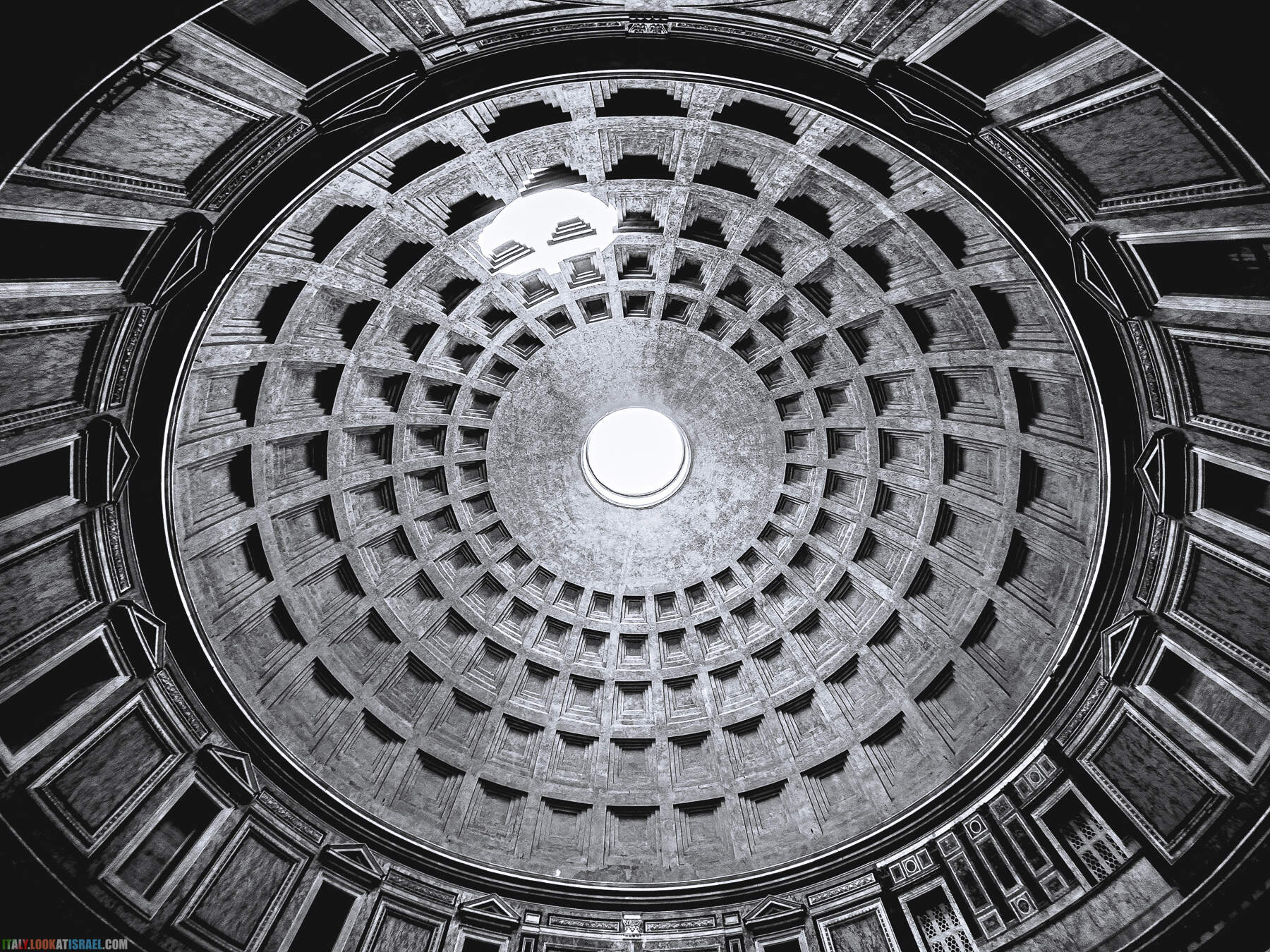 Его высота от пола равна его диаметру (43 метра), а это значит, что во внутренне пространство Пантеона можно вместить полную сферу — идеальную форму, символизирующую образ Вселенной. Купол храма олицетворяет небесный свод, освещаемый главным небесным светилом — Солнцем.