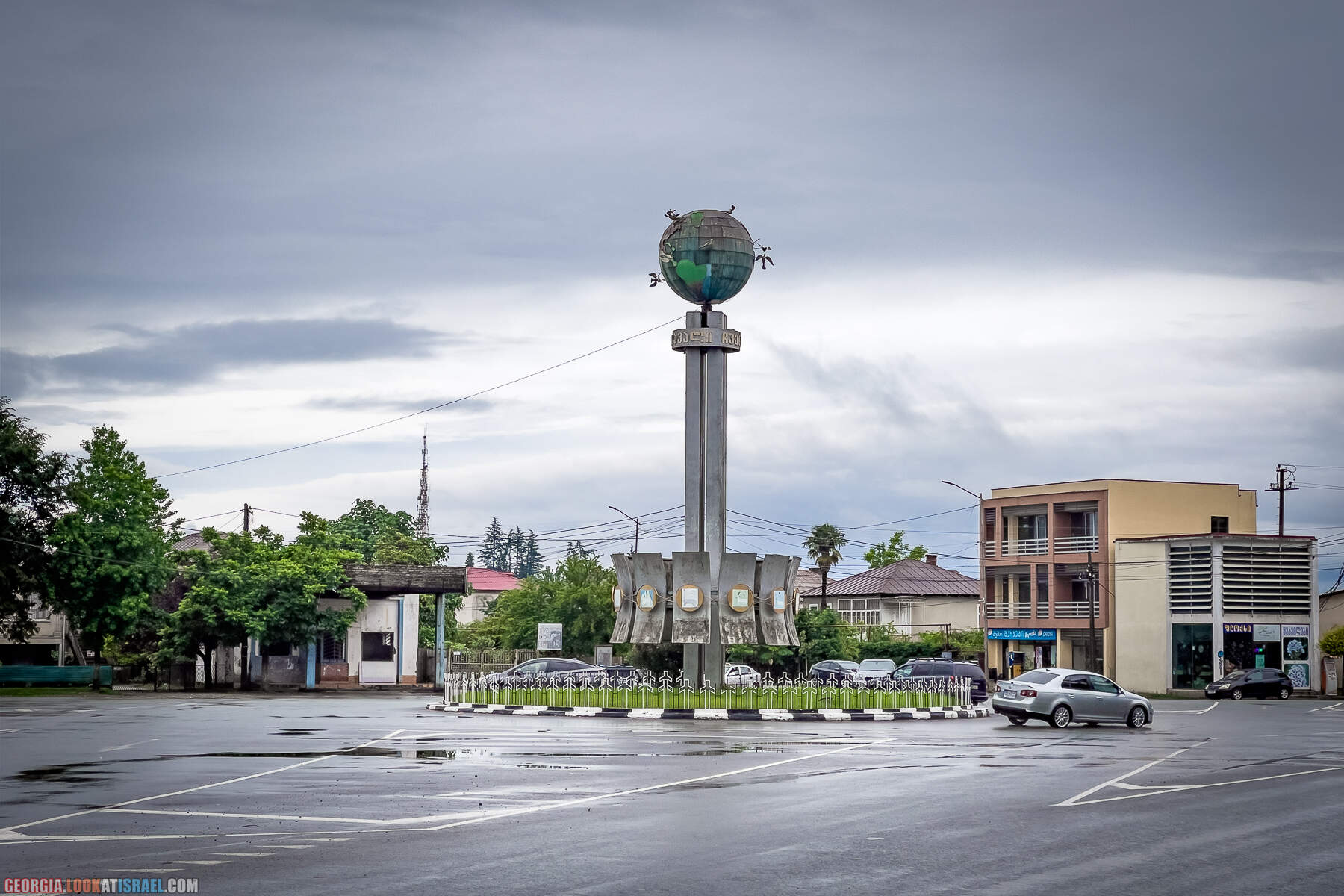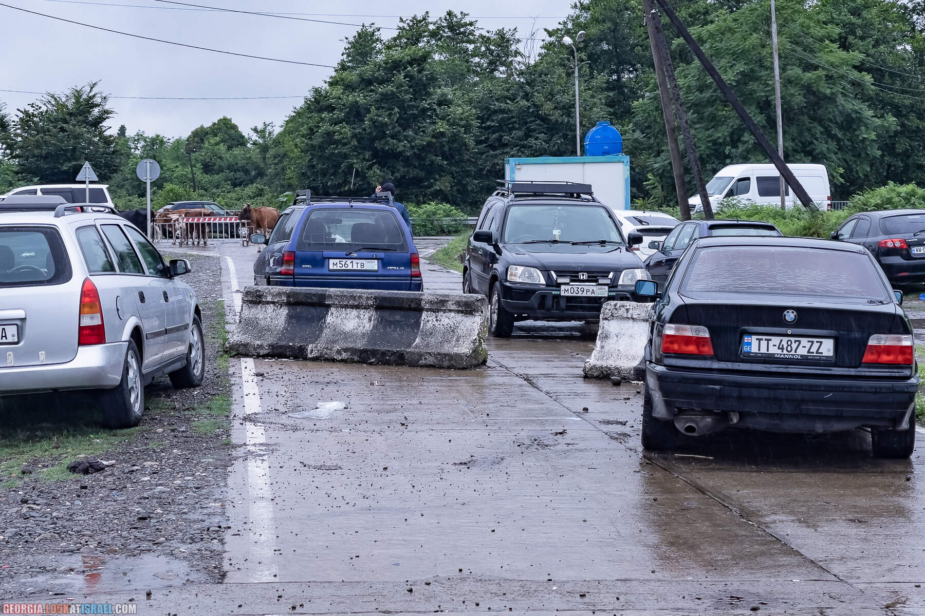 Жители Абхазии могут свободной пересекать реку по этому мосту и въезжать в Грузии (но лишь на определённую прилегающую территорию), а вот грузины не могут. Да им это и не надо. Уровень жизни в их стране гораздо выше чем по ту сторону и именно поэтому абхазы приезжают в Зугдиди на машинах с абхазскими номерами (смотрите на две машины в центре с той стороны бетонных блоков), пересаживаются на свои машины с грузинскими номерами и едут закупаться. После чего вернувшись перегружают весь товар в первую машину и возвращаются в Абхазию.