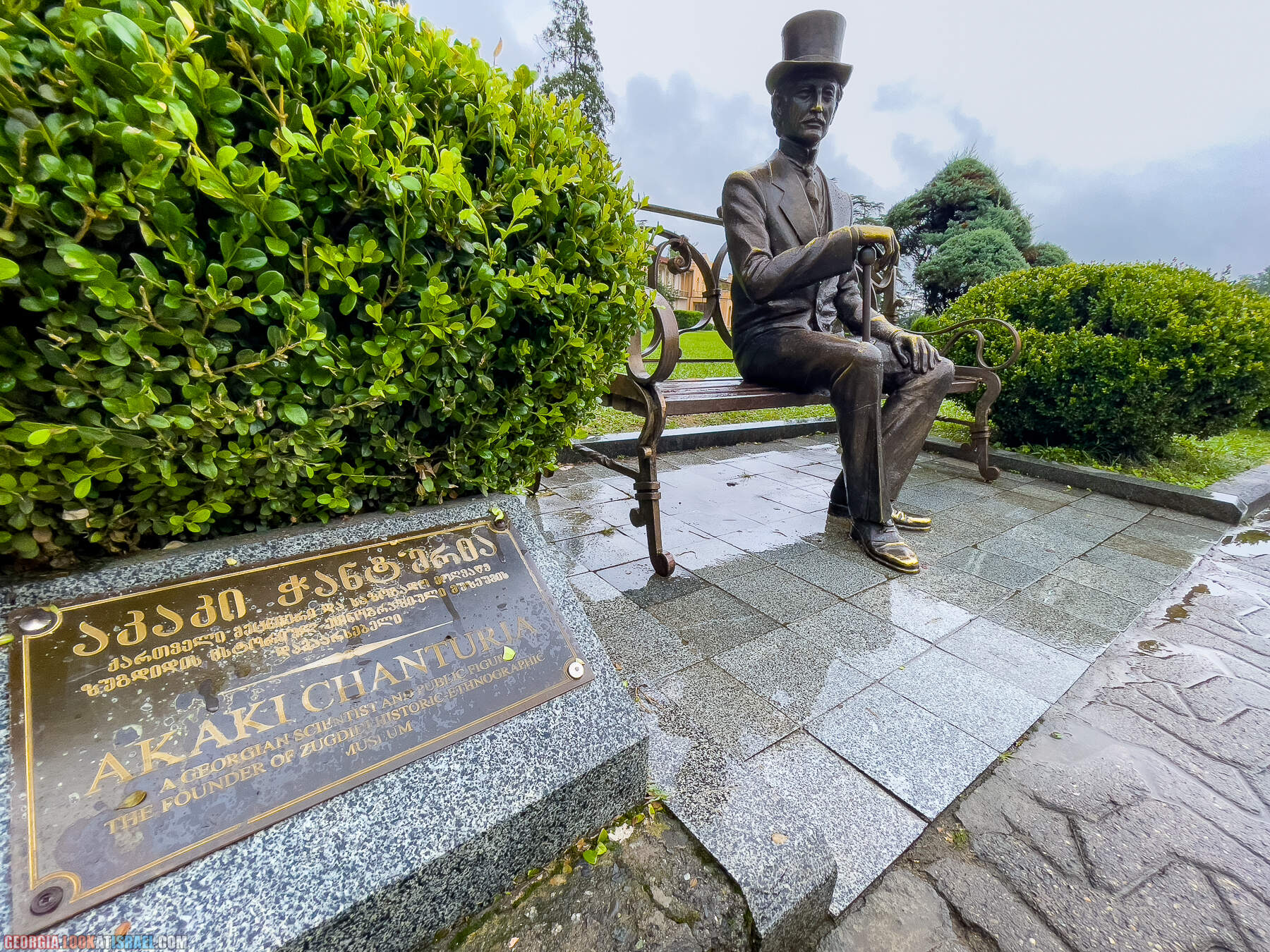 А на одной из скамеек сидит Акакий Чантурия — грузинский ученый и основатель историко-этнографического музея Зугдиди.